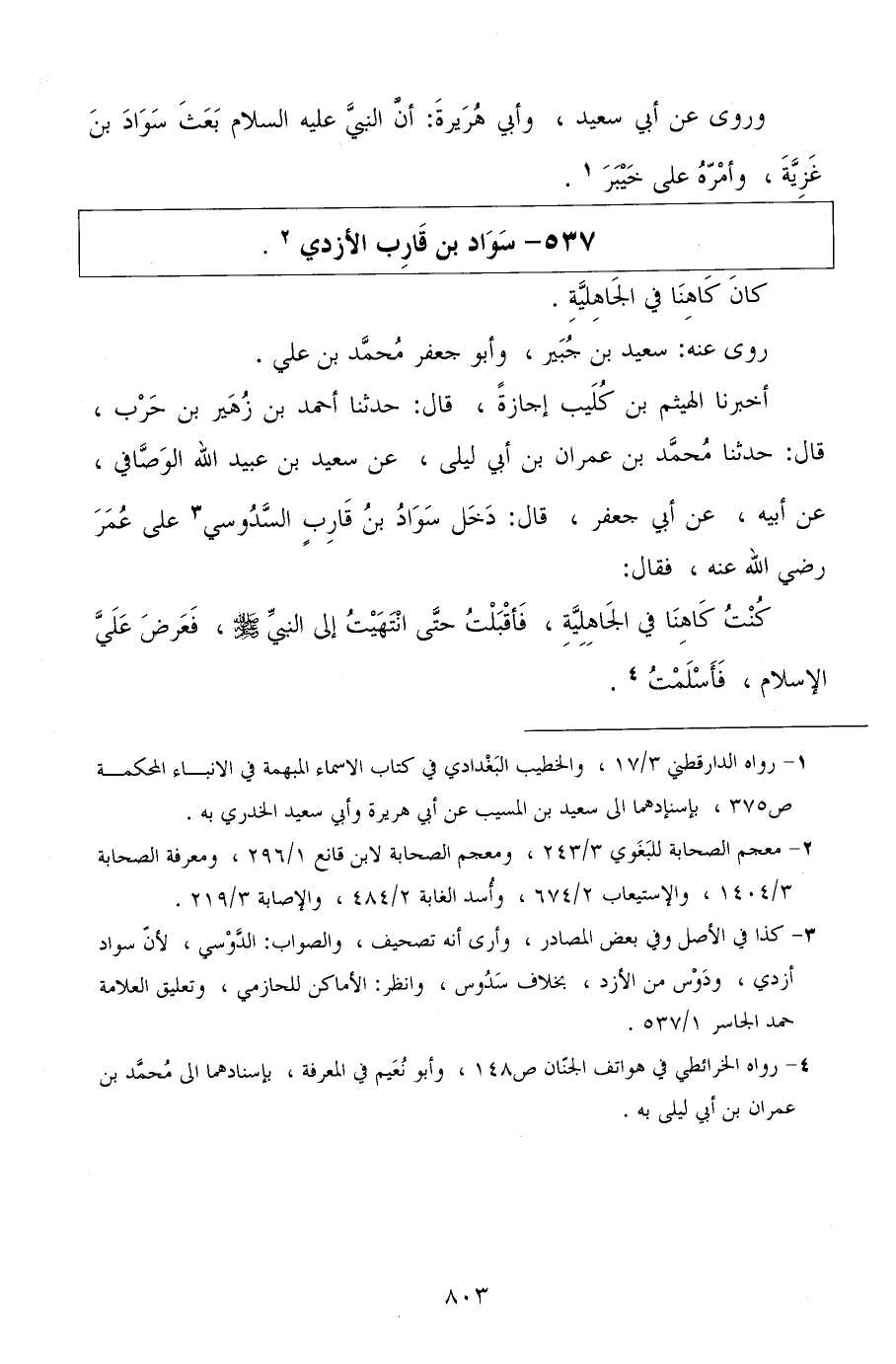 أخبرنا الهيثم بن كليب إجازة، قال: حدثنا أحمد بن زهير بن حرب، قال: حدثنا محمد بن عمران بن أبي ليلى، عن سعيد بن عبيد الله الوصافي، عن أبيه، عن أبي جعفر، قال: دخل سواد بن قارب السدوسي على عمر رضي الله عنه، فقال: كنت كاهنا في الجاهلية، فأقبلت حتى انتهيت إلى النبي صلى الله عليه وسلم، فعرض علي الإسلام، فأسلمت.