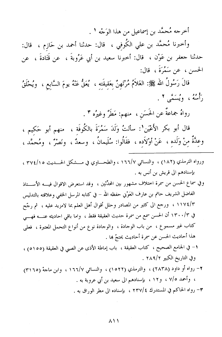 وأخبرنا محمد بن علي الكوفي، قال: حدثنا أحمد بن حازم، قال: حدثنا جعفر بن عون، قال: أخبرنا سعيد بن أبي عروبة، عن قتادة، عن الحسن، عن سمرة، قال: قال رسول الله صلى الله عليه وسلم: الغلام مرتهن بعقيقته، يعق عنه يوم السابع، ويحلق رأسه، ويسمى.