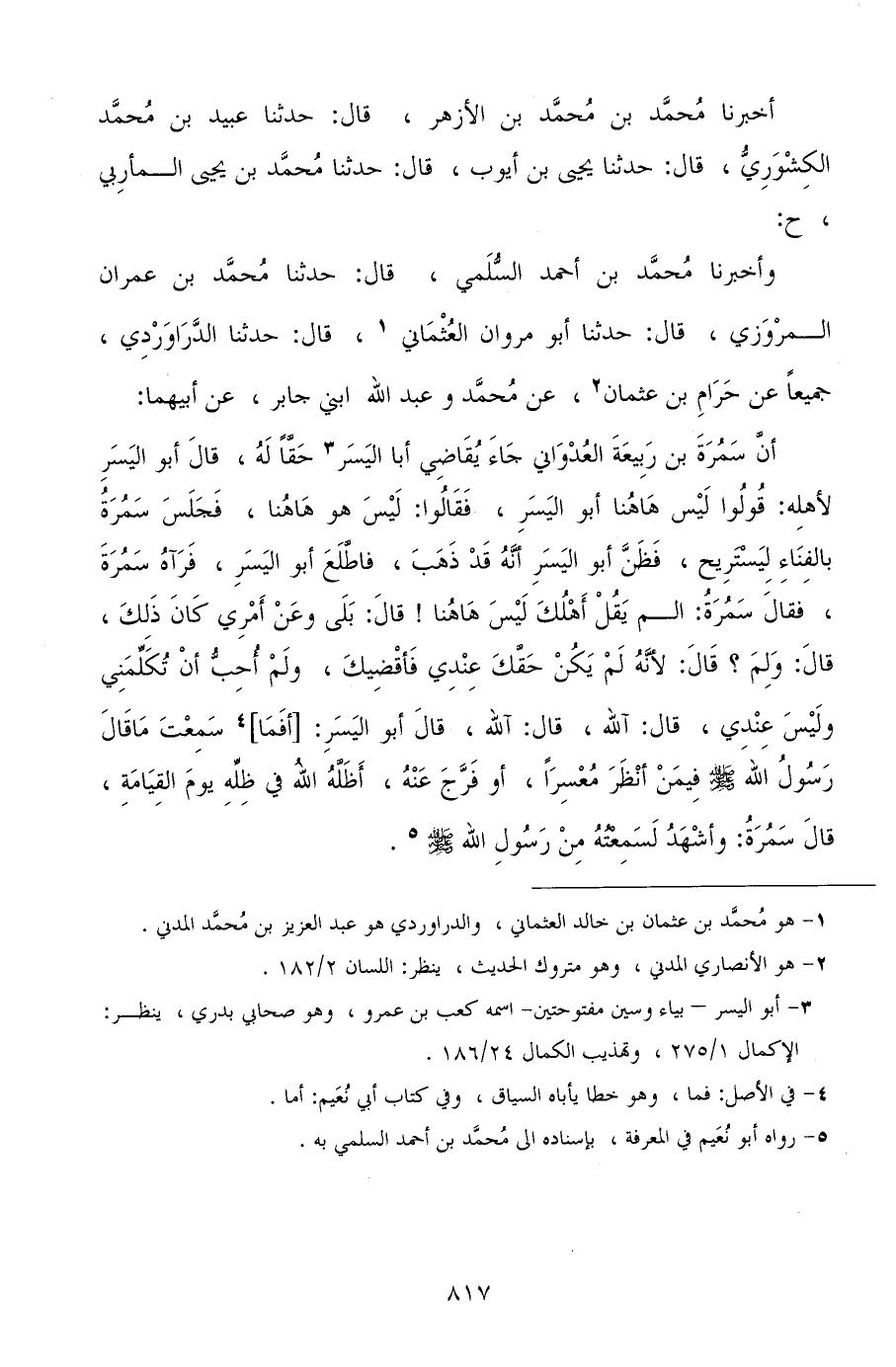 ح وأخبرنا محمد بن أحمد السلمي، قال: حدثنا محمد بن عمران المروزي، قال: حدثنا أبو مروان العثماني، قال: حدثنا الدراوردي، جميعًا عن حرام بن عثمان، عن محمد، وعبد الله ابني جابر، عن أبيهما: أن سمرة بن ربيعة العدواني جاء يقاضي أبا اليسر حقًا له، قال أبو اليسر لأهله: قولوا ليس ههنا أبو اليسر، فقالوا: ليس هو ههنا، فجلس سمرة بالفناء ليستريح، فظن أبو اليسير أنه قد ذهب، فاطلع أبو اليسر، فرآه سمرة، فقال سمرة: الم يقل أهلك ليس ههنا! قال: بلى وعن أمري كان ذلك، قال: ولم؟ قال: لأنه لم يكن حقك عندي فَأَقْضِيَكَ، ولم أحب أن تكلمني وليس عندي، قال: آلله، قال: آلله، قال أبو اليسر: أفما سمعت ما قال رسول الله صلى الله عليه وسلم فيمن أنظر معسرًا، أو فرج عنه، أظله الله في ظله يوم القيامة، قال سمرة: وأشهد لسمعته من رسول الله صلى الله عليه وسلم.
