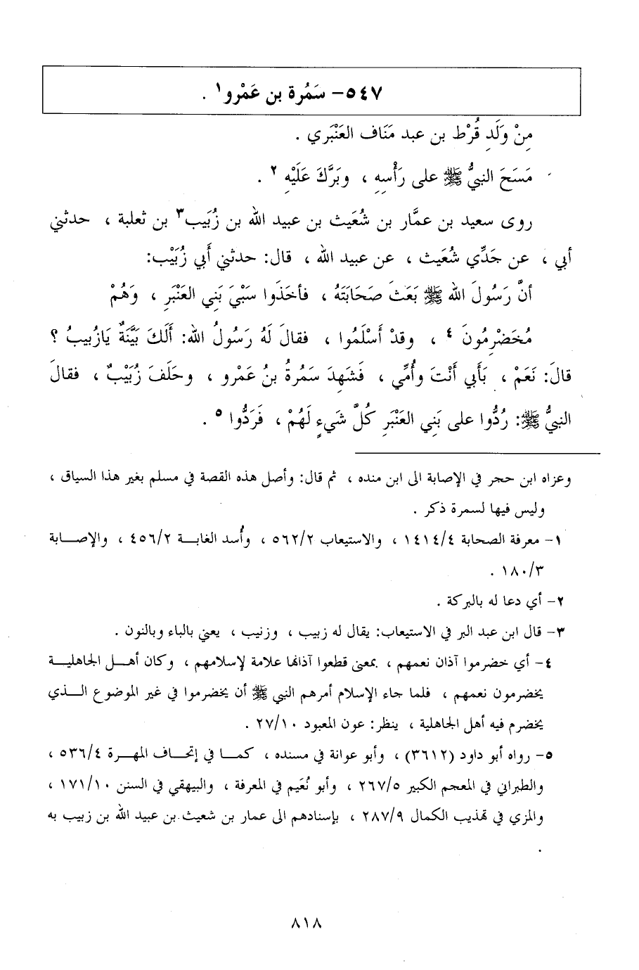 روى سعيد بن عمار بن شعيث بن عبيد الله بن زبيب بن ثعلبة، حدثني أبي، عن جدي شعيث، عن عبيد الله، قال: حدثني أبي زبيب: أن رسول الله صلى الله عليه وسلم بعث صحابته، فأخذوا سبي بني العنبر، وهم مخضرمون، وقد أسلموا، فقال له رسول الله: ألك بينة يا زبيب؟ قال: نعم، بأبي أنت وأمي، فشهد سمرة بن عمرو، وحلف زبيب، فقال النبي صلى الله عليه وسلم: ردوا على بني العنبر كل شيء لهم، فردوا.
