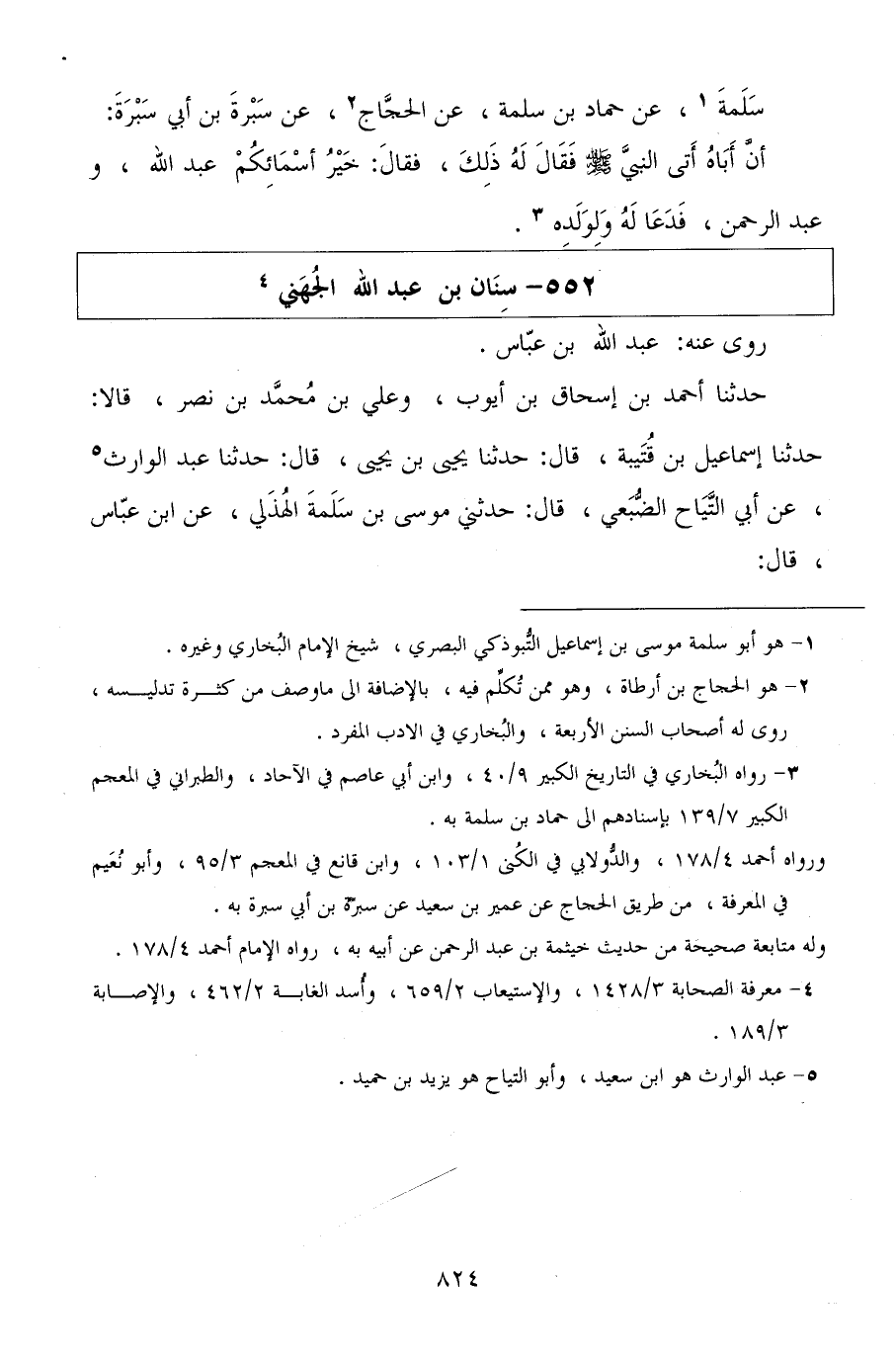 سلمة، عن حماد بن سلمة، عن الحجاج، عن سبرة بن أبي سبرة: أن أباه أتى النبي صلى الله عليه وسلم فقال له ذلك، فقال: خير أسمائكم عبد الله، وعبد الرحمن، فدعا له ولولده.