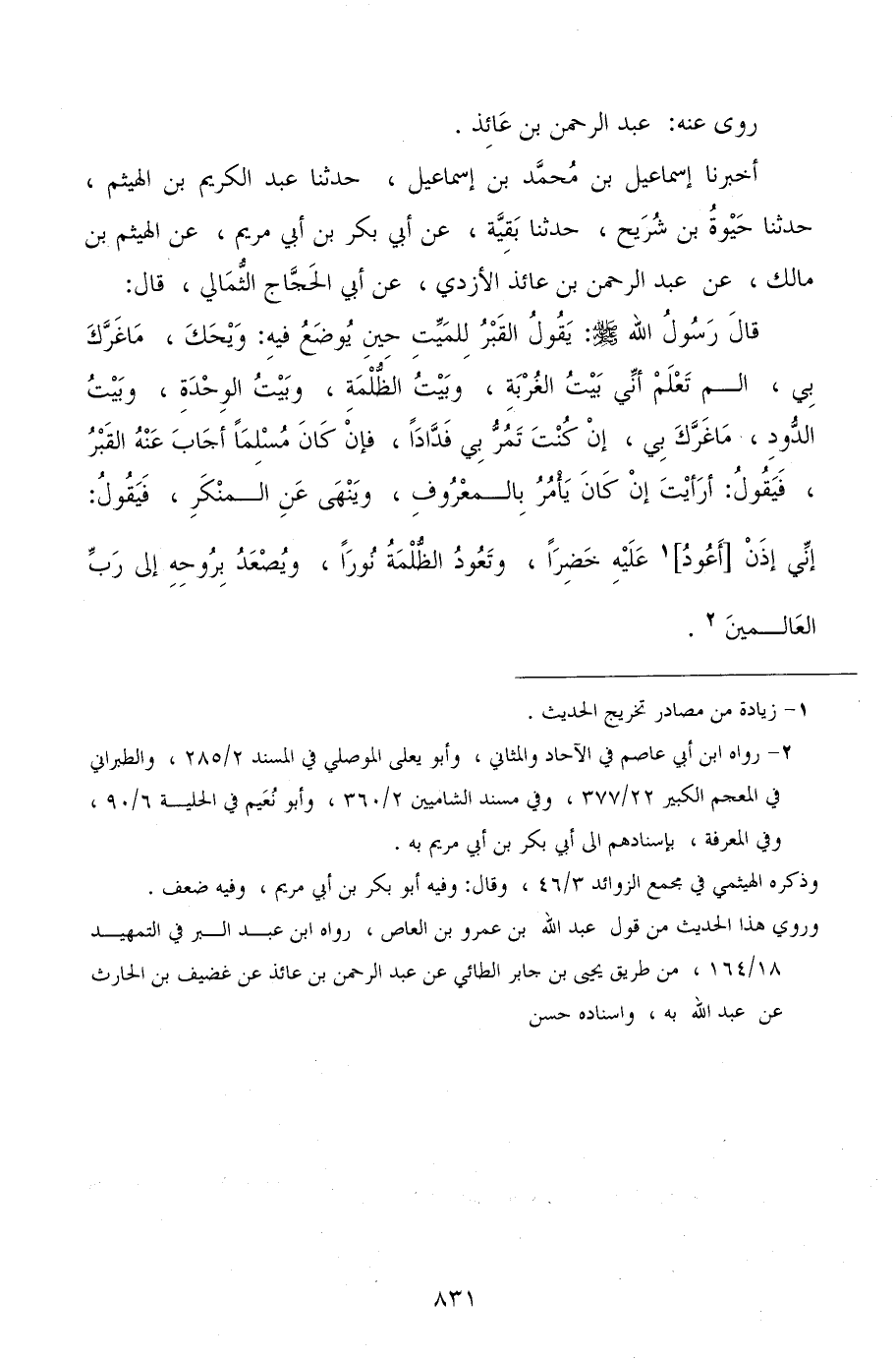 أخبرنا إسماعيل بن محمد بن إسماعيل، حدثنا عبد الكريم بن الهيثم، حدثنا حيوة بن شريح، حدثنا بقية، عن أبي بكر بن أبي مريم، عن الهيثم بن مالك، عن عبد الرحمن بن عائذ الأزدي، عن أبي الحجاج الثمالي، قال: قال رسول الله صلى الله عليه وسلم: " يقول القبر للميت حين يوضع فيه: ويحك، ما غرك بي، الم تعلم أني بيت الغربة، وبيت الظلمة، وبيت الوحدة، وبيت الدود، ما غرك بي، إن كنت تمر بي فدادا، فإن كان مسلمًا أجاب عنه القبر، فيقول: أرأيت إن كان يأمر بالمعروف، وينهى عن المنكر، فيقول: إني إذن أعود عليه خضرًا، وتعود الظلمة نورًا، ويصعد بروحه إلى رب العالمين.