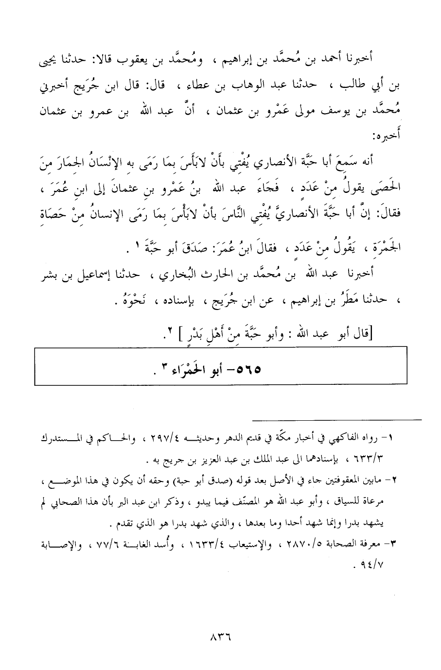 أخبرنا أحمد بن محمد بن إبراهيم، ومحمد بن يعقوب قالا: حدثنا يحيى بن أبي طالب، حدثنا عبد الوهاب بن عطاء، قال: قال ابن جريج، أخبرني محمد بن يوسف مولى عمرو بن عثمان، أن عبد الله بن عمرو بن عثمان أخبره: أنه سمع أبا حبة الأنصاري يفتي بأن لا بأس بما رمى به الإنسان الجمار من الحصى يقول من عدد، فجاء عبد الله بن عمرو بن عثمان إلى ابن عمر، فقال: إن أبا حبة الأنصاري يفتي الناس بأن لا بأس بما رمى الإنسان من حصاة الجمرة، يقول من عدد، فقال ابن عمر: صدق أبو حبة.