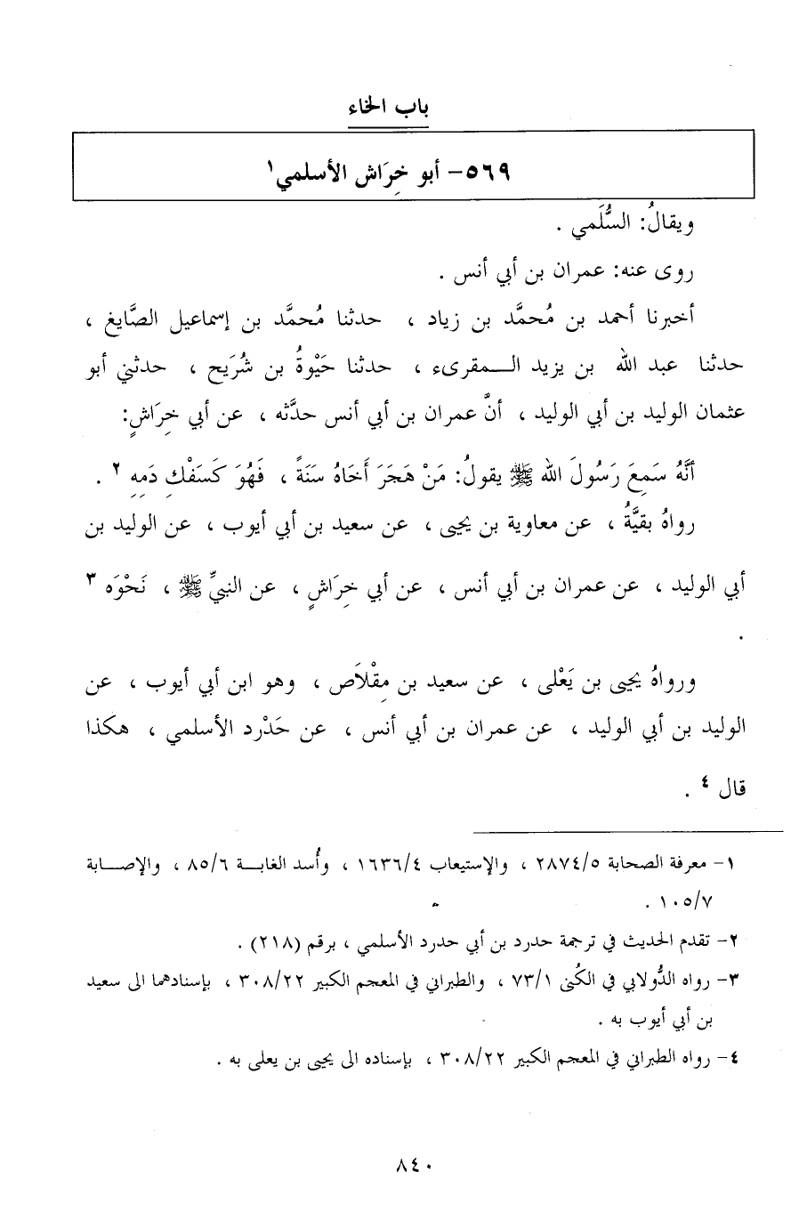أخبرنا أحمد بن محمد بن زياد، حدثنا محمد بن إسماعيل الصايغ، حدثنا عبد الله بن يزيد المقرئ، حدثنا حيوة بن شريح، حدثني أبو عثمان الوليد بن أبي الوليد، أن عمران بن أبي أنس حدثه، عن أبي خراش: أنه سمع رسول الله صلى الله عليه وسلم يقول: من هجر أخاه سنة، فهو كسفك دمه.