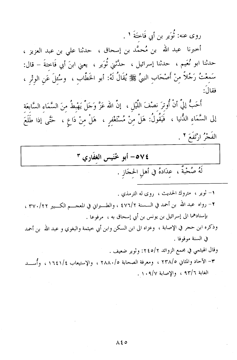 أخبرنا عبد الله بن محمد بن إسحاق، حدثنا علي بن عبد العزيز، حدثنا أبو نعيم، حدثنا إسرائيل، حدثني ثوير: يعني ابن أبي فاخنة قال: سمعت رجلا من أصحاب النبي صلى الله عليه وسلم يقال له: أبو الخطاب، وسأل عن الوتر، فقال: أحب إلي أن أوتر نصف الليل، إن الله عز وجل يهبط من السماء السابعة إلى السماء الدنيا، فيقول: هل من مستغفر، هل من داع، حتى إذ طلع الفجر ارتفع.