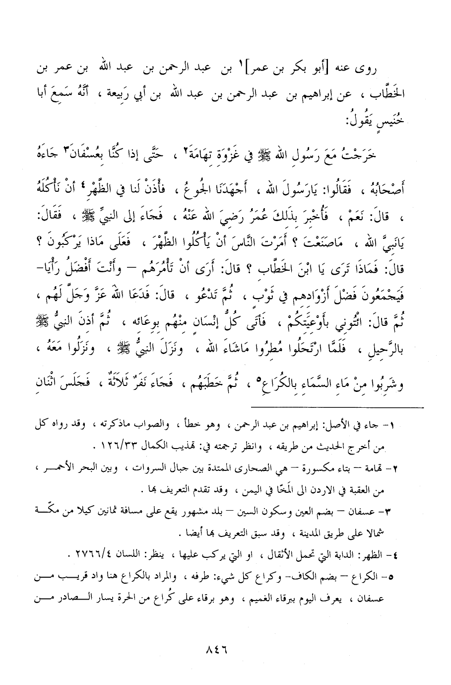 روى عنه أبو بكر بن عمر بن عبد الرحمن بن عبد الله بن عمر بن الخطاب، عن إبراهيم بن عبد الرحمن بن عبد الله بن أبي ربيعة، أنه سمع أبا خنيس يقول: خرجت مع رسول الله صلى الله عليه وسلم في غزوة تهامة، حتى إذا كنا بعسفان جاءه أصحابه، فقالوا: يا رسول الله، أجهدنا الجوع، فأذن لنا في الظهر أن نأكله، قال: نعم، فأخبر بذلك عمر رضي الله عنه، فجاء إلى النبي صلى الله عليه وسلم، فقال: يا نبي الله، ما صنعت؟ أمرت الناس أن يأكلوا الظهر، فعلى ماذا يركبون؟ قال: فماذا ترى يا ابن الخطاب؟ قال: أرى أن تأمرهم وأنت أفضل رأيا فيجمعون فضل أزوادهم في ثوب، ثم تدعو، قال: فدعا الله عز وجل له، ثم قال: ائتوني بأوعيتكم، فأتى كل إنسان منهم بوعائه، ثم أذن النبي صلى الله عليه وسلم بالرحيل، فلما ارتحلوا مطروا ما شاء الله، ونزل النبي صلى الله عليه وسلم، ونزلوا معه، وشربوا من ماء السماء بالكراع، ثم خطبهم، فجاء نفر ثلاثة، فجلس اثنان