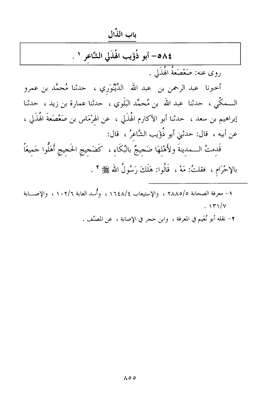 أخبرنا عبد الرحمن بن عبد الله الدينوري، حدثنا محمد بن عمرو المكي، حدثنا عبد الله بن محمد البلوي، حدثنا عمارة بن زيد، حدثنا إبراهيم بن سعد، حدثنا أبو الآكارم الهذلي، عن الهرماس بن صعصعة الهذلي، عن أبيه، قال: حدثني أبو ذؤيب الشاعر، قال: قدمت المدينة ولأهلها ضجيج بالبكاء، كضجيج الحجيج أهلوا جميعًا بالإحرام، فقلت: مه، قالوا: هلك رسول الله صلى الله عليه وسلم.