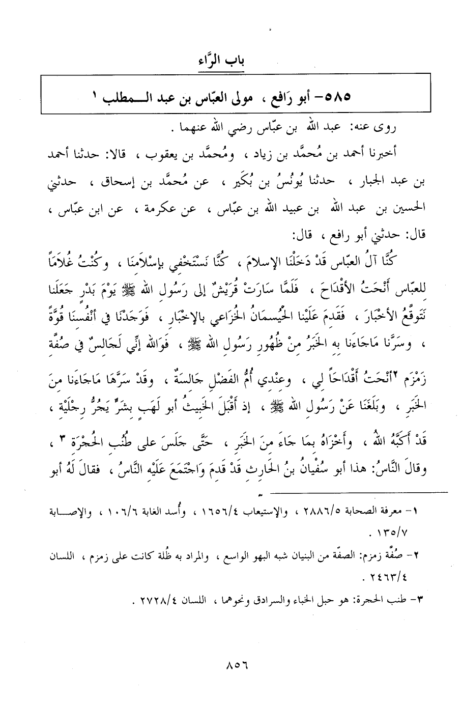 أخبرنا أحمد بن محمد بن زياد، ومحمد بن يعقوب، قالا: حدثنا أحمد بن عبد الجبار، حدثنا يونس بن بكير، عن محمد بن إسحاق، حدثني الحسين بن عبد الله بن عبيد الله بن عباس، عن عكرمة، عن ابن عباس، حدثني أبو رافع، قال: كنا آل العباس قد دخلنا الإسلام، كنا نستخفي بإسلامنا، وكنت غلامًا للعباس أنحت الأقداح، فلما سارت قريش إلى رسول الله صلى الله عليه وسلم يوم بدر جعلنا مع الأخبار، فقدم علينا الحيسمان الخزاعي بالإخبار، فوجدنا في أنفسنا قوة وسرنا ما جاءنا به الخبر من ظهور رسول الله صلى الله عليه وسلم، فوالله إني لجالس في صفة زمزم أنحت أقداحًا لي، وعندي أم الفضل جالسة، وقد سرها ما جاءنا من الخبر، وبلغنا عن رسول الله صلى الله عليه وسلم، إذ أقبل الخبيث أبو لهب بشر يجر رجليه، وقد أكبه الله، وأخزاه بما جاء من الخبر، حتى جلس على طنب الحجرة، وقال الناس: هذا أبو سفيان بن الحارث قد قدم واجتمع عليه الناس، فقال له أبو