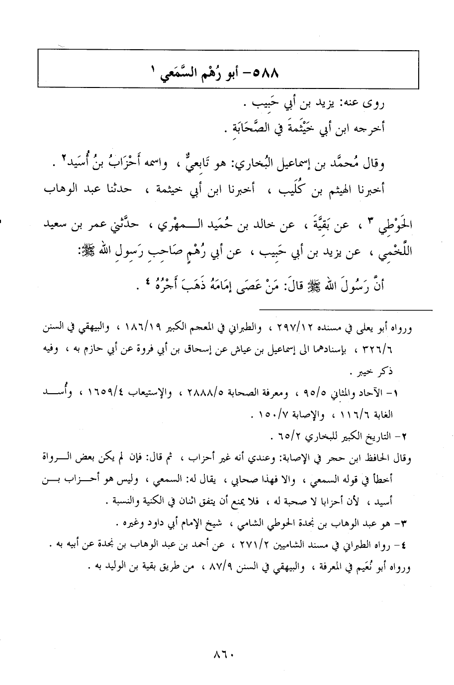 أخبرنا الهيثم بن كليب، أخبرنا ابن أبي خيثمة، حدثنا عبد الوهاب الحوطي، عن بقية، عن خالد بن حميد المهري، حدثني عمر بن سعيد اللخمي، عن يزيد بن أبي حبيب، عن أبي رهم صاحب رسول الله صلى الله عليه وسلم: أن رسول الله صلى الله عليه وسلم قال: من عصى إمامه ذهب أجره.