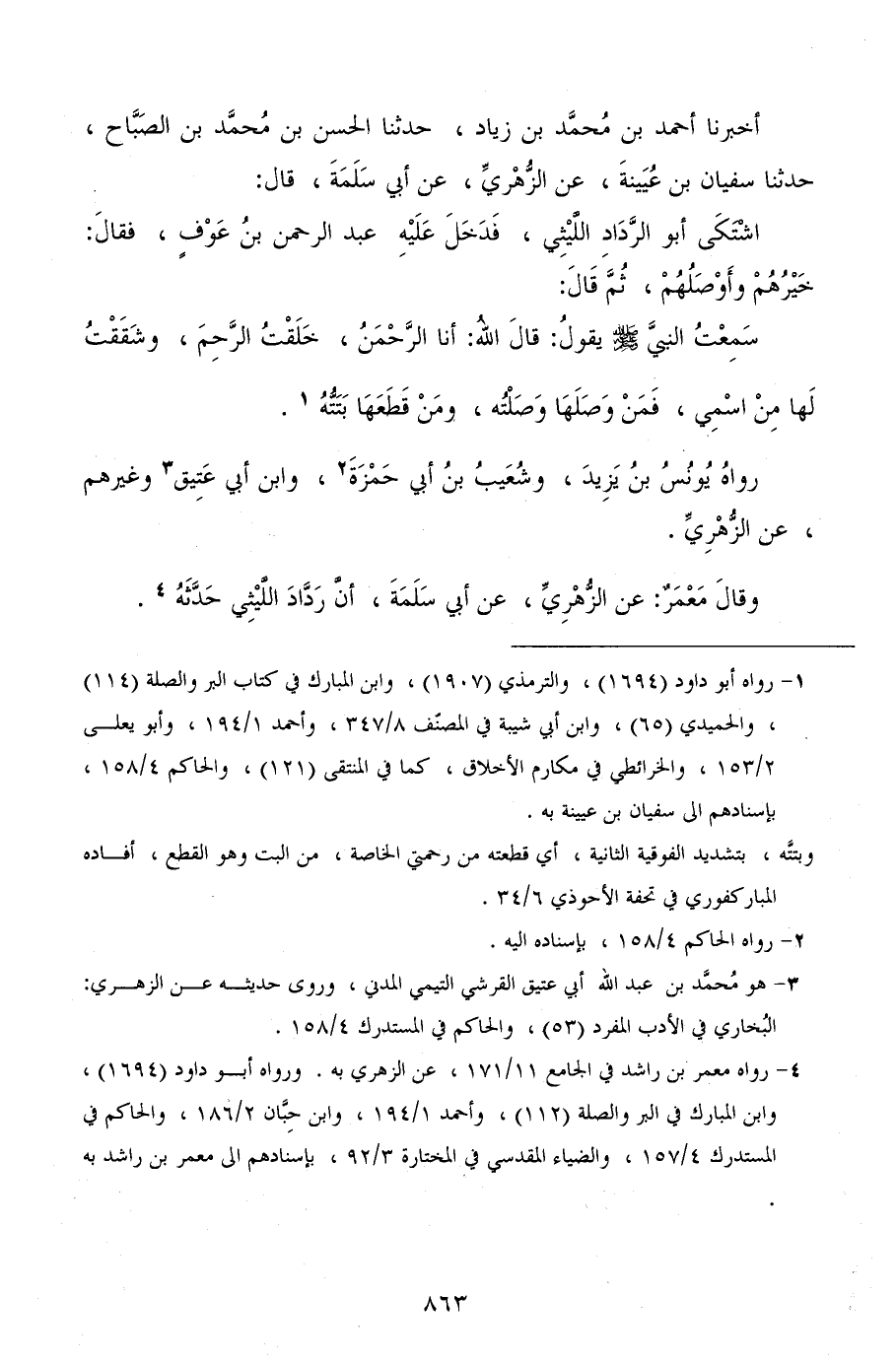 أخبرنا أحمد بن محمد بن زياد، حدثنا الحسن بن محمد بن الصباح، حدثنا سفيان بن عيينة، عن الزهري، عن أبي سلمة، قال: اشتكى أبو الرداد الليثي، فدخل عليه عبد الرحمن بن عوف، فقال: خيرهم وأوصلهم، ثم قال: سمعت النبي صلى الله عليه وسلم يقول: قال الله: أنا الرحمن، خلقت الرحم، وشققت لها من اسمي، فمن وصلها وصلته، ومن قطعها بتته.