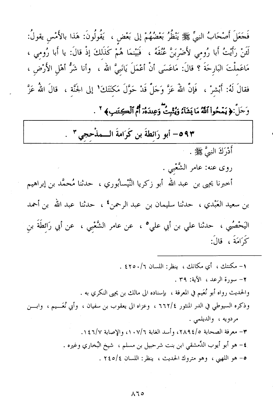أخبرنا يحيى بن عبد الله أبو زكريا النيسابوري، حدثنا محمد بن إبراهيم بن سعيد العبدي، حدثنا سليمان بن عبد الرحمن، حدثنا عبد الله بن أحمد اليحصي، حدثنا علي بن أبي علي، عن عامر الشعبي، عن أبي رائطة بن كرامة، قال:
