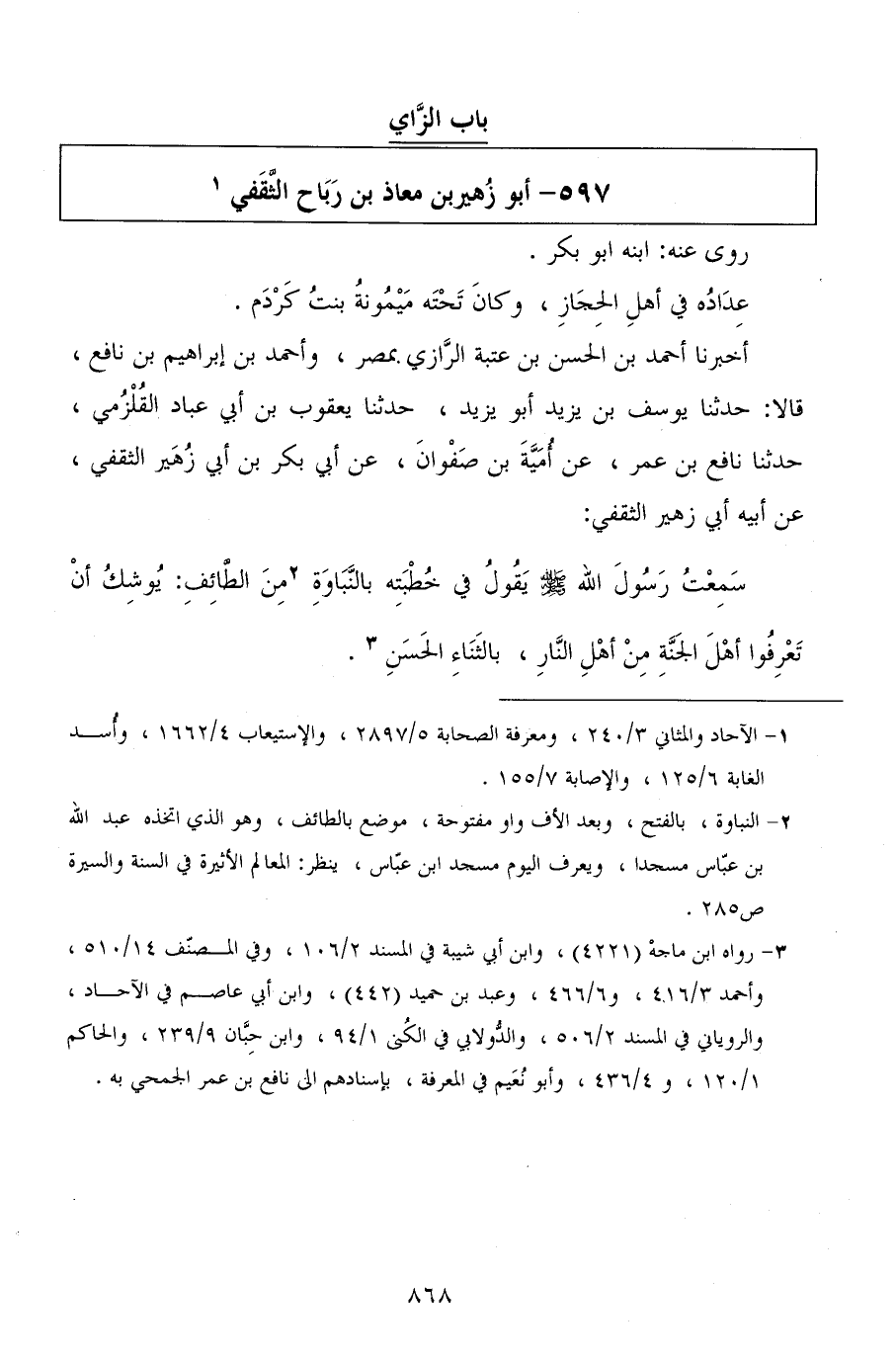 أخبرنا أحمد بن الحسن بن عتبة الرازي بمصر، وأحمد بن إبراهيم بن نافع، قالا: حدثنا بن يزيد أبو يزيد، حدثنا يعقوب بن أبي عباد القلزمي، حدثنا نافع بن عمر، عن أمية بن صفوان، عن أبي بكر بن أبي زهير الثقفي، عن أبيه أبي زهير الثقفي: سمعت رسول الله صلى الله عليه وسلم يقول في خطبته بالنباوة من الطائف: يوشك أن تعرفوا أهل الجنة من أهل النار، بالثناء الحسن.