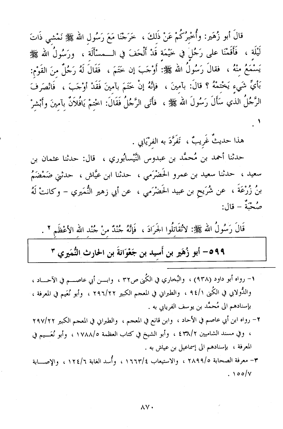 حدثنا أحمد بن محمد بن عبدوس النيسابوري، قال: حدثنا عثمان بن سعيد، حدثنا سعيد بن عمرو الحضرمي، حدثنا ابن عياش، حدثني ضمضم بن زرعة، عن شريح بن عبيد الحضرمي، عن أبي زهير النميري وكانت له صحبة قال: قال رسول الله صلى الله عليه وسلم: لا تقاتلوا الجراد، فإنه جند من جند الله الأعظم.