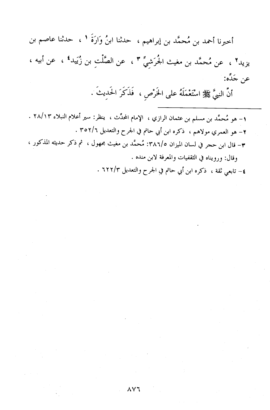 أخبرنا أحمد بن محمد بن إبراهيم، حدثنا ابن وارة، حدثنا عاصم بن يزيد، عن محمد بن مغيث الجرشي، عن الصلت بن زييد، عن أبيه، عن جده: أن النبي صلى الله عليه وسلم استعمله على الخرص، فذكر الحديث.