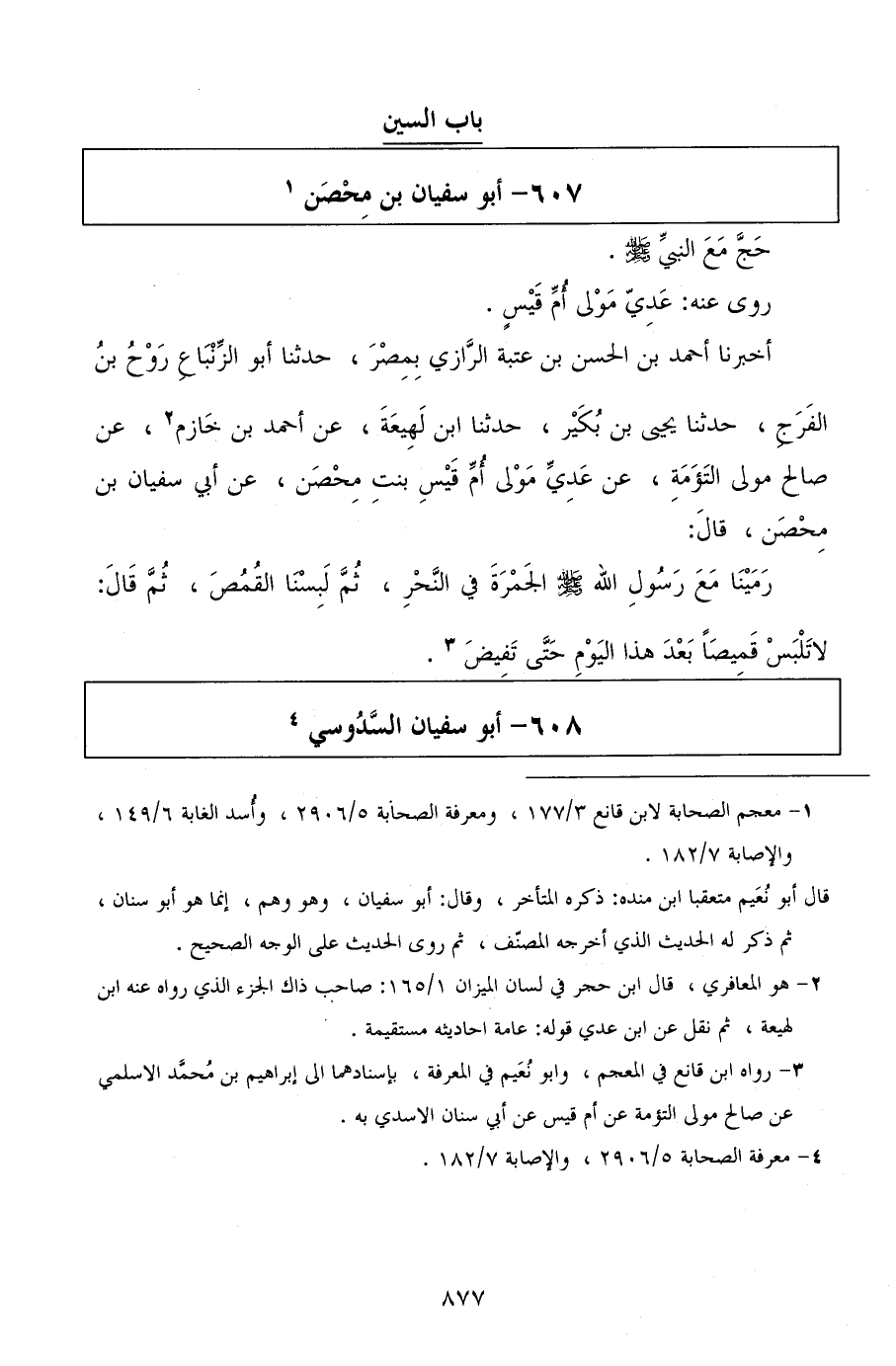 أخبرنا أحمد بن الحسن بن عتبة الرازي بمصر، حدثنا أبو الزنباع روح بن الفرج، حدثنا يحيى بن بكير، حدثنا ابن لهيعة، عن أحمد بن حازم، عن صالح مولى التؤمة، عن عدي أم قيس بنت محصن، عن أبي سفيان بن محصن، قال: رمينا مع رسول الله صلى الله عليه وسلم الجمرة في النحر، ثم لبسنا القمص، ثم قال: لا تلبس قميصًا بعد هذا اليوم حتى تفيض.
