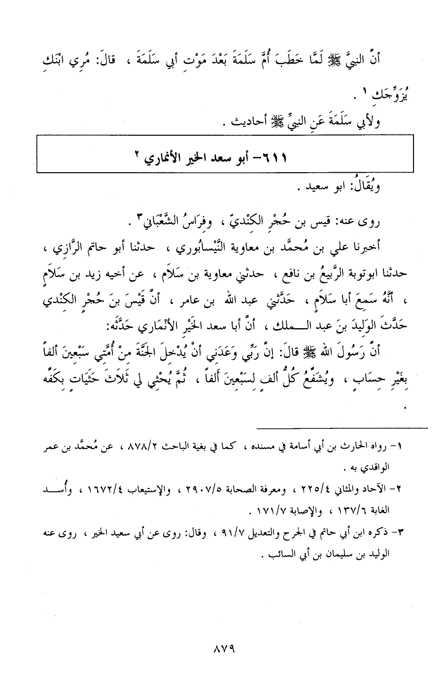 أخبرنا علي بن محمد بن معاوية النيسابوري، حدثنا أبو حاتم الرازي، حدثنا أبو توبة الربيع بن نافع، حدثني معاوية بن سلام، عن أخيه زيد بن سلام، أنه سمع أبا سلام، حدثني عبد الله بن عامر، أن قيس بن حجر الكندي حدث الوليد بن عبد الملك، أن أبا سعد الخير الأنماري حدثه: أن رسول الله صلى الله عليه وسلم قال: إن ربي وعدني أن يدخل الجنة من أمتي سبعين ألفًا بغير حساب، ويشفع كل ألف لسبعين ألفًا، ثم يحثي لي ثلاث حثيات بكفه.