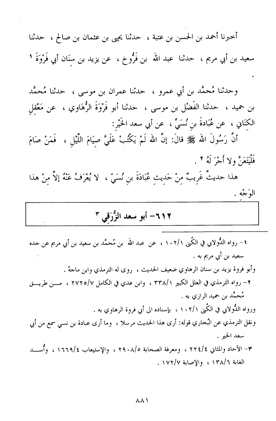 وحدثنا محمد بن أبي عمرو، حدثنا عمران بن موسى، حدثنا محمد بن حميد، حدثنا الفضل بن موسى، حدثنا أبو فروة الرهاوي، عن معقل الكناني، عن عبادة بن نسي، عن أبي سعد الخير: أن رسول الله صلى الله عليه وسلم قال: إن الله لم يكتب علي صيام الليل، فمن صام فليتعن ولا أجر له.
