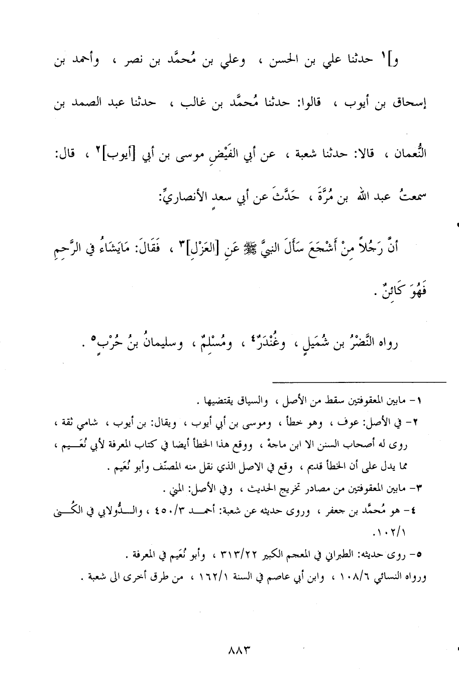 ح وحدثنا علي بن الحسن، وعلي بن محمد بن نصر، وأحمد بن إسحاق بن أيوب، قالوا: حدثنا محمد بن غالب، حدثنا عبد الصمد بن النعمان، قالا: حدثنا شعبة، عن أبي الفيض موسى بن أبي أيوب، قال: سمعت عبد الله بن مرة، حدث عن أبي سعد الأنصاري: أن رجلا من أشجع سأل النبي صلى الله عليه وسلم عن العزل، فقال: ما يشاء في الرحم فهو كائن.