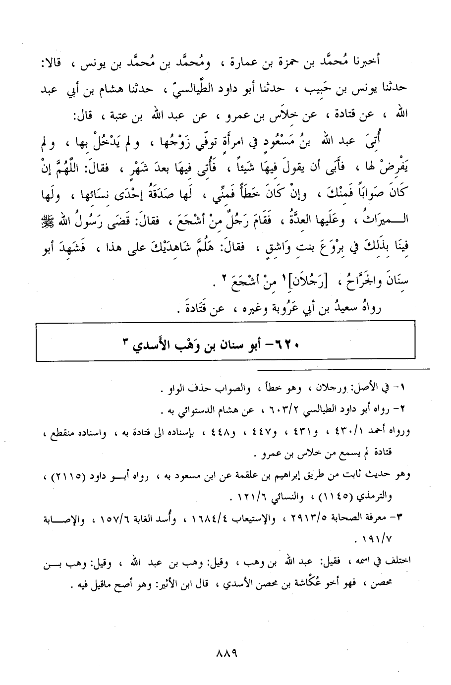 أخبرنا محمد بن حمزة بن عمارة، ومحمد بن محمد بن يونس، قالا: حدثنا يونس بن حبيب، حدثنا أبو داود الطيالسي، حدثنا هشام بن أبي عبد الله، عن قتادة، عن خلاس بن عمرو، عن عبد الله بن عتبة، قال: أتى عبد الله بن مسعود في امرأة توفي زوجها: ولم يدخل بها، ولم يفرض لها، فأبى أن يقول فيها شيئًا، فأتى فيها بعد شهر، فقال: اللهم إن كان صوابًا فمنك، وإن كان خطأ فمني، لها صدقة إحدى نسائها، ولها الميراث، وعليها العدة، فقام رجل من أشجع، فقال: قضى رسول الله صلى الله عليه وسلم فينا بذلك في بروع بنت واشق، فقال: هلم شاهديك على هذا، فشهد أبو سنان، والجراح، رجلان من أشجع.