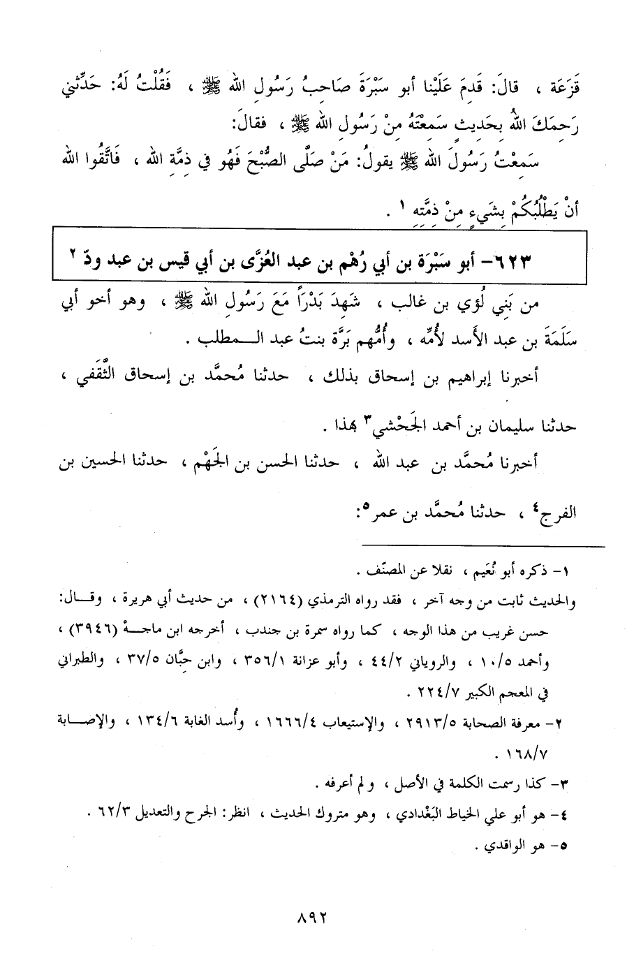 قزعة، قال: قدم علينا أبو سبرة صاحب رسول الله صلى الله عليه وسلم، فقلت له: حدثني رحمك الله بحديث سمعته من رسول الله صلى الله عليه وسلم، فقال: سمعت رسول الله صلى الله عليه وسلم يقول: من صلى الصبح فهو في ذمة الله، فاتقوا الله أن يطلبكم بشيء من ذمته.