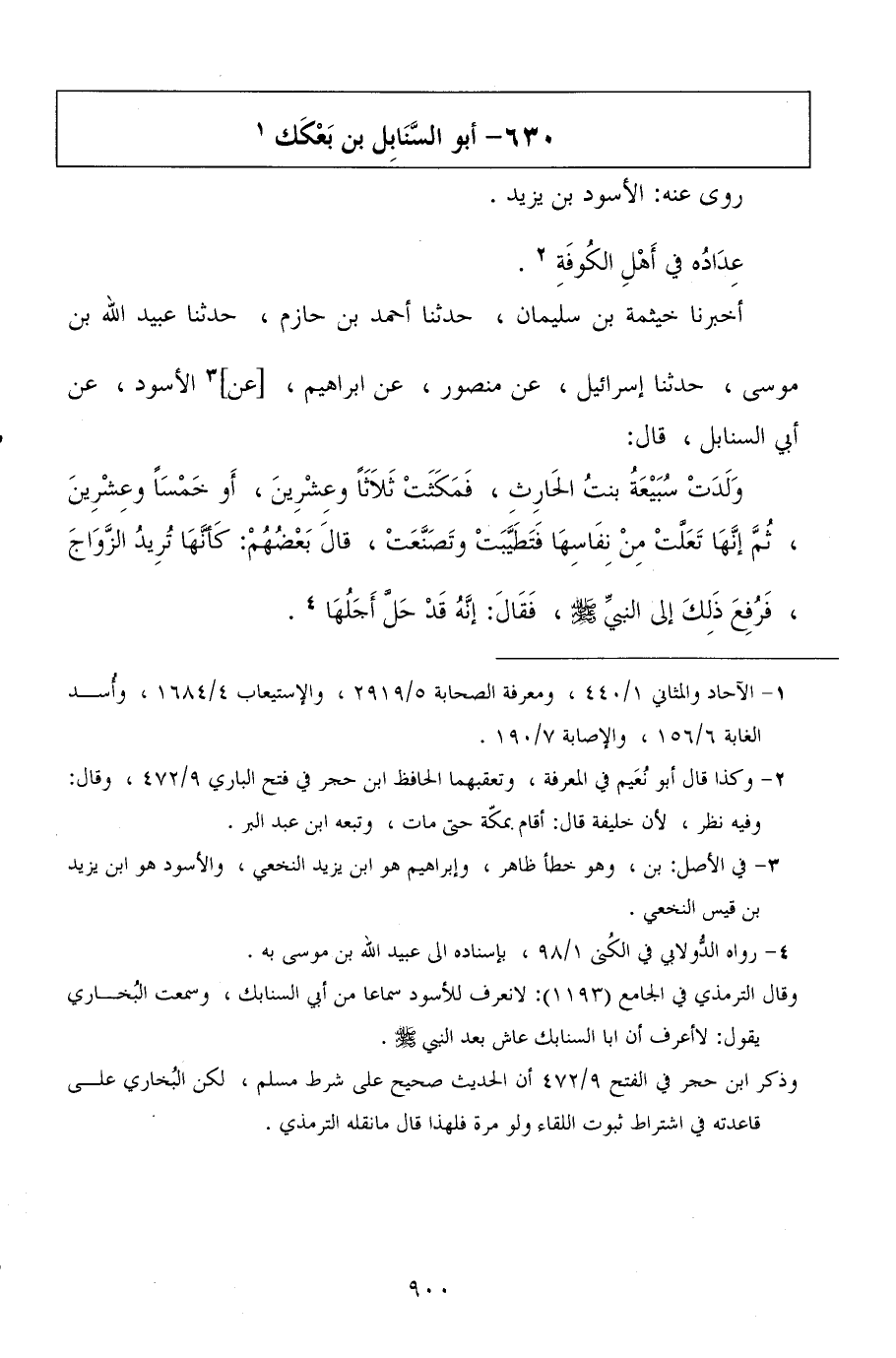 أخبرنا خيثمة بن سليمان، حدثنا أحمد بن حازم، حدثنا عبيد الله بن موسى، حدثنا إسرائيل، عن منصور، عن إبراهيم، عن الأسود، عن أبي السنابل، قال: ولدت سبيعة بنت الحارث، فمكثت ثلاثًا وعشرين، أو خمسًا وعشرين، ثم إنها تعلت من نفاسها فتطيبت وتصنعت، قال بعضهم: كأنها تريد الزواج، فرفع ذلك إلى النبي صلى الله عليه وسلم، فقال: «إنه قد حل أجلها» .