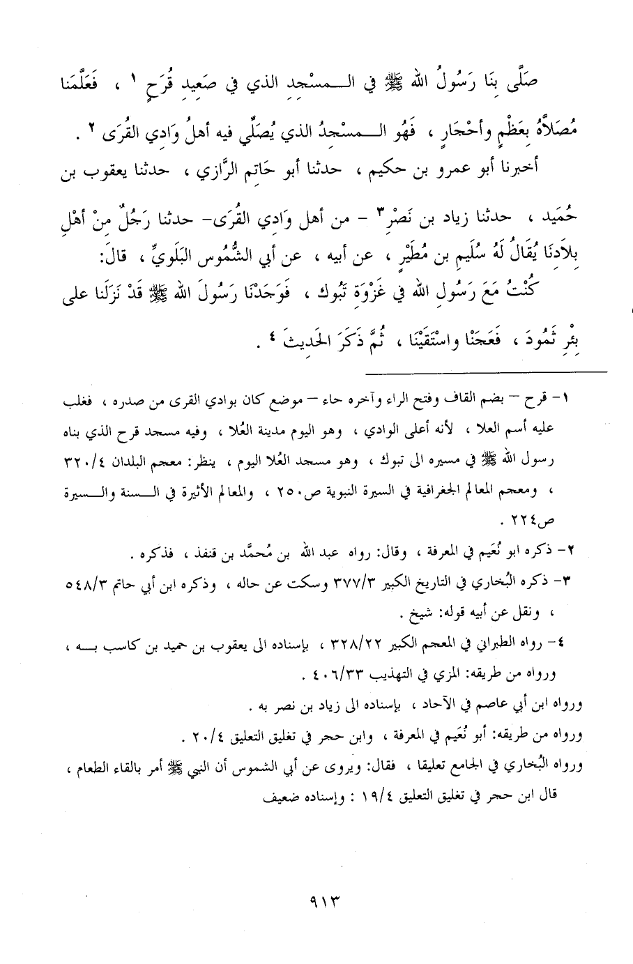 صلى بنا رسول الله صلى الله عليه وسلم في المسجد الذي في صعيد قرح، فعلمنا مصلاه بعظم وأحجار، فهو المسجد الذي يصلي فيه أهل وادي القرى.