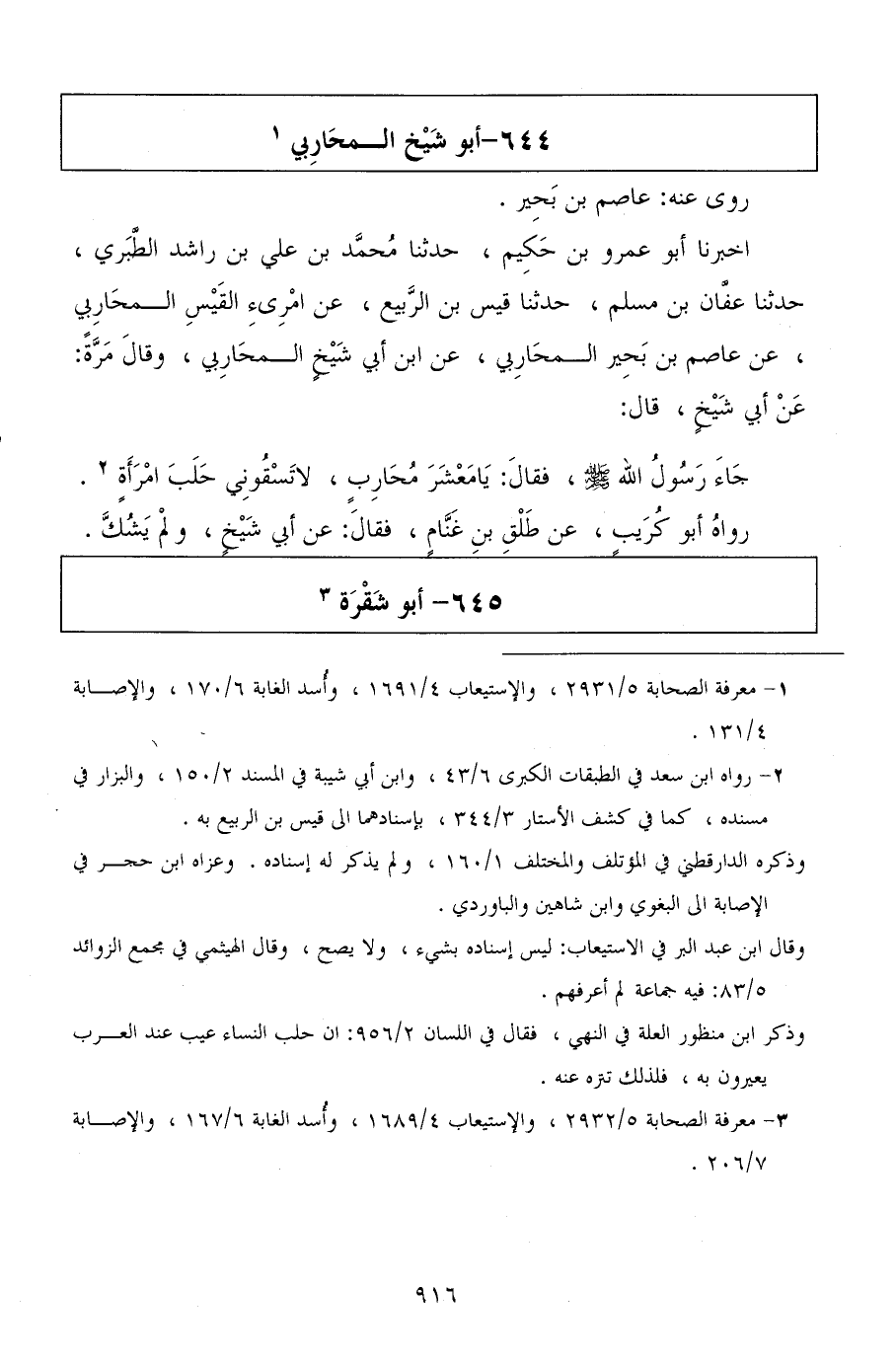 أخبرنا أبو عمرو بن حكيم، حدثنا محمد بن علي بن راشد الطبري، حدثنا عفان بن مسلم، حدثنا قيس بن الربيع، عن امرئ القيس المحاربي، عن عاصم بن بحير المحاربي، عن ابن أبي شيخ المحاربي، وقال مرة: عن أبي شيخ، قال: جاء رسول الله صلى الله عليه وسلم، فقال: يا معشر محارب، لا تسقوني حلب امرأة.