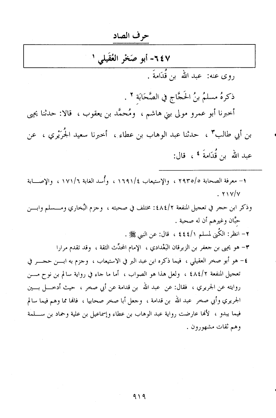 أخبرنا أبو عمرو مولى بني هاشم، ومحمد بن يعقوب، قالا: حدثنا يحيى بن أبي طالب، حدثنا عبد الوهاب بن عطاء، أخبرنا سعيد الجريري، عن عبد الله بن قدامة، قال: