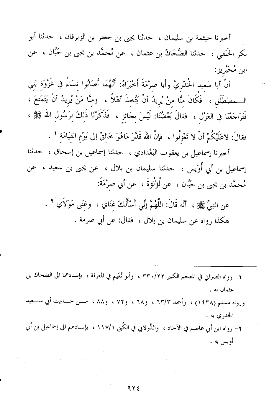 أخبرنا خيثمة بن سليمان، حدثنا يحيى بن جعفر بن الزبرقان، حدثنا أبو بكر الحنفي، حدثنا الضحاك بن عثمان، عن محمد بن يحيى بن حبان، عن ابن محيريز: أنا أبا سعيد الخدري، وأبا صرمة أخبراه: أنهما أصابوا نساء في غزوة بني المصطلق، فكان منا من يريد أن يتخذ أهلا، ومنا من يريد أن يتمتع، فتراجعنا في العزل، فقال بعضنا: ليس بجائز، فذكرنا ذلك لرسول الله صلى الله عليه وسلم، فقال: لا عليكم أن لا تعزلوا، فإن الله قدر ما هو خالق إلى يوم القيامة.