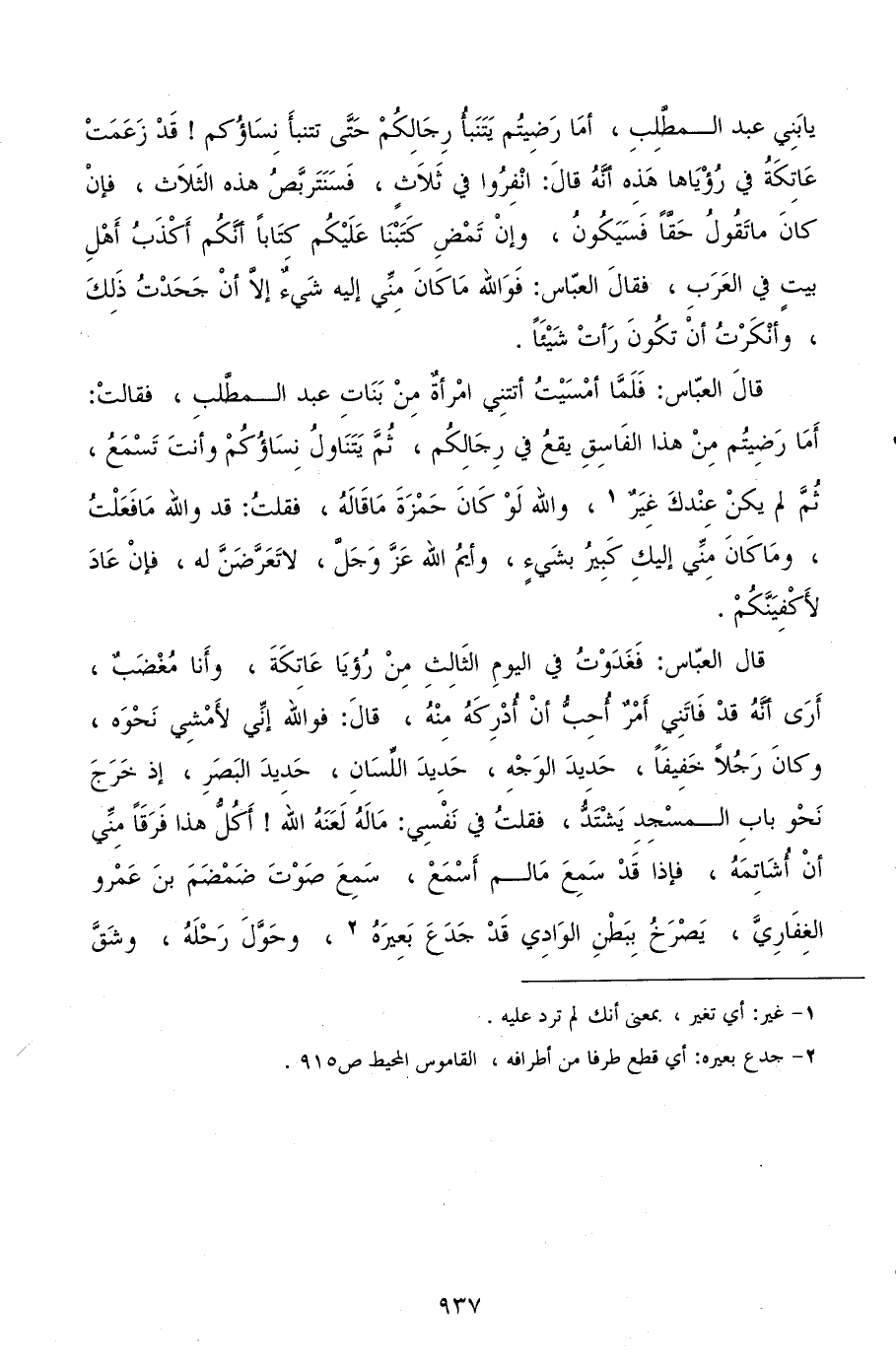يا بني عبد المطلب، أما رضيتم يتنبأ رجالكم حتى تتنبأ نساؤكم! قد زعمت عاتكة في رؤياها هذه أنه قال: انفروا في ثلاث، فسنتربص هذه الثلاث، فإن كان ما تقول حقًا فسيكون، وإن تمض كتبنًا عليكم كتابًا أنكم أكذب أهل بيت في العرب، فقال العباس: فوالله ما كان مني إليه شيء إلا أن جحدت ذلك، وأنكرت أن تكون رأت شيئًا.