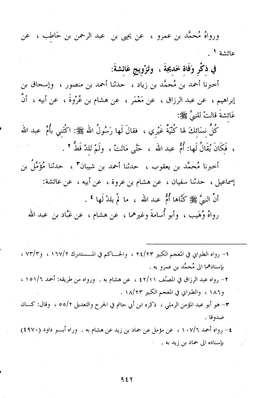 أخبرنا أحمد بن محمد بن زياد، حدثنا أحمد بن منصور، وإسحاق بن إبراهيم، عن عبد الرزاق، عن معمر، عن هشام بن عروة، عن أبيه، أن عائشة قالت للنبي صلى الله عليه وسلم: كل نسائك لها كنية غيري، فقال لها رسول الله صلى الله عليه وسلم: اكتني بأم عبد الله، فكان يقال لها: أم عبد الله، حتى ماتت، ولم تلد قط.