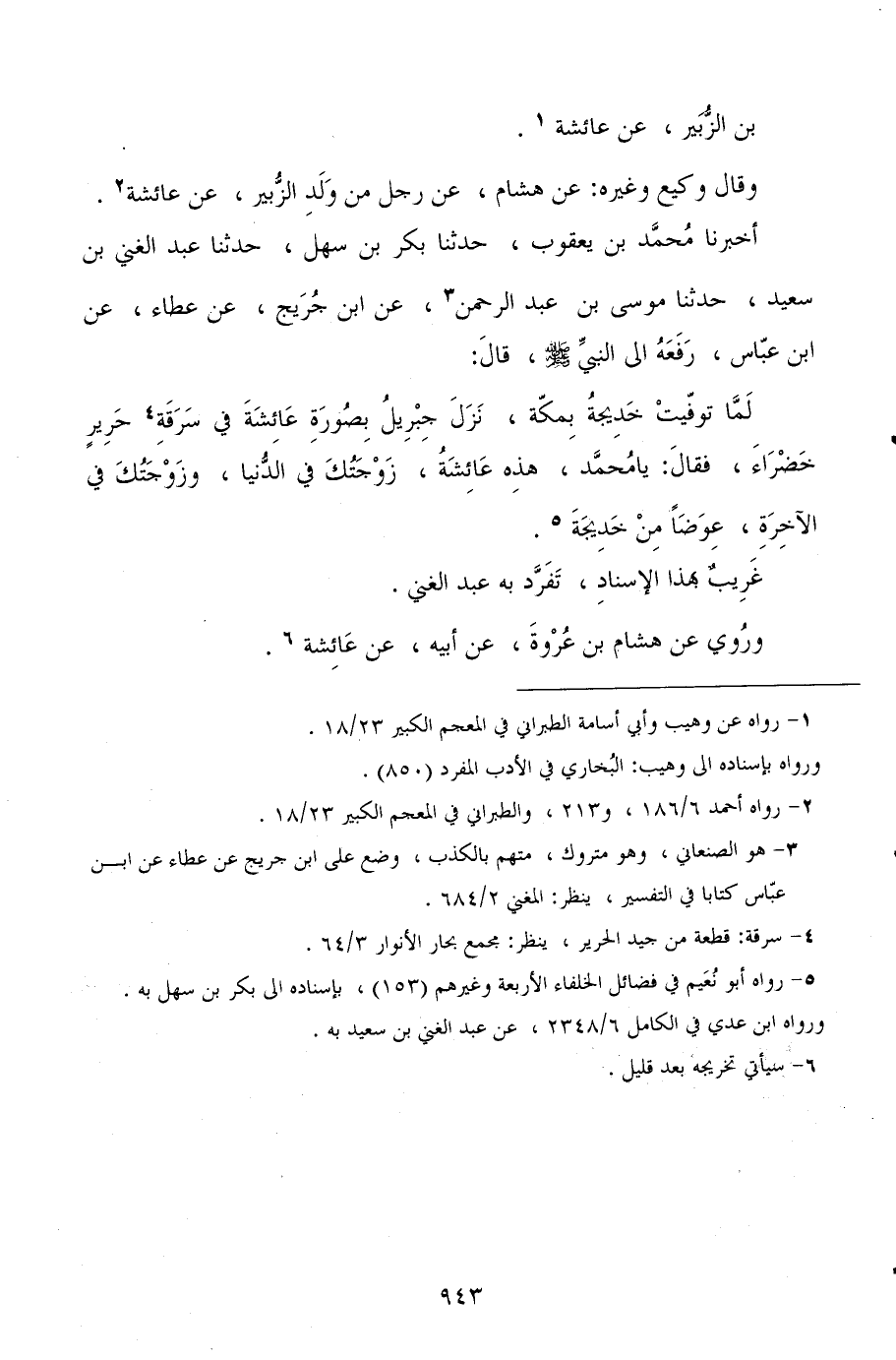 أخبرنا محمد بن يعقوب، حدثنا بكر بن سهل، حدثنا عبد الغني بن سعيد، حدثنا موسى بن عبد الرحمن، عن ابن جريج، عن عطاء، عن ابن عباس، رفعه إلى النبي صلى الله عليه وسلم، قال: لما توفيت خديجة بمكة، نزل جبريل بصورة عائشة في سرقة حرير خضراء، فقال: يا محمد، هذه عائشة، زوجتك في الدنيا، وزوجتك في الآخرة، عوضًا من خديجة.