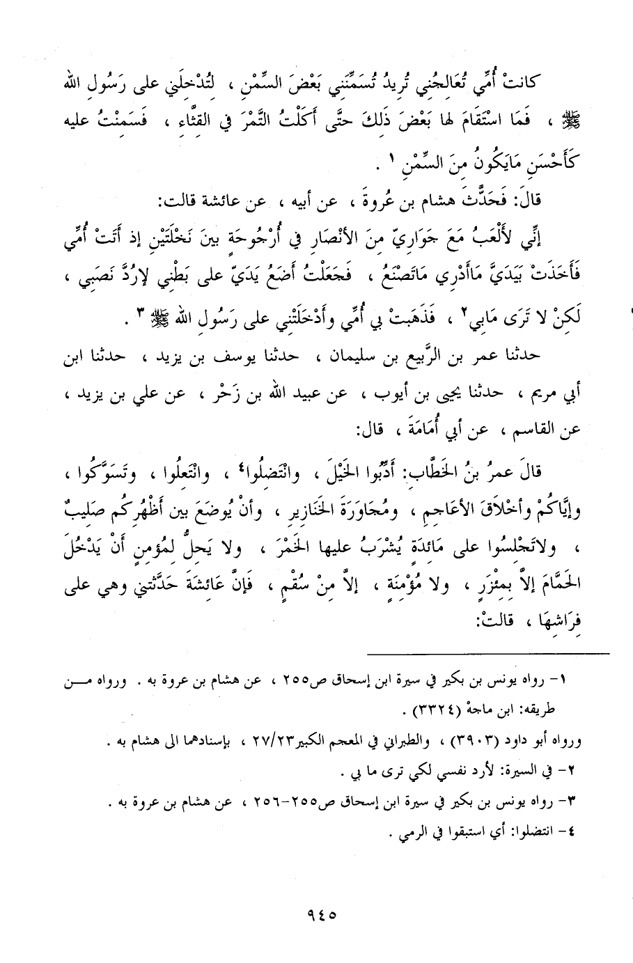 حدثنا عمر بن الربيع بن سليمان، حدثنا يوسف بن يزيد، حدثنا ابن أبي مريم، حدثنا يحيى بن أيوب، عن عبيد الله بن زحر، عن علي بن يزيد، عن القاسم، عن أبي أمامة، قال: قال عمر بن الخطاب، أدبوا الخيل، وانتضلوا، وانتعلوا، وتسوكوا، وإياكم وأخلاق الأعاجم، ومجاورة الخنازير، وأن يوضع بين أظهركم صليب، ولا تجلسوا على مائدة يشرب عليها الخمر، ولا يحل لمؤمن أن يدخل الحمام إلا بمئزر، ولا مؤمنة، إلا من سقم، فإن عائشة حدثتني وهي على فراشها، قالت: