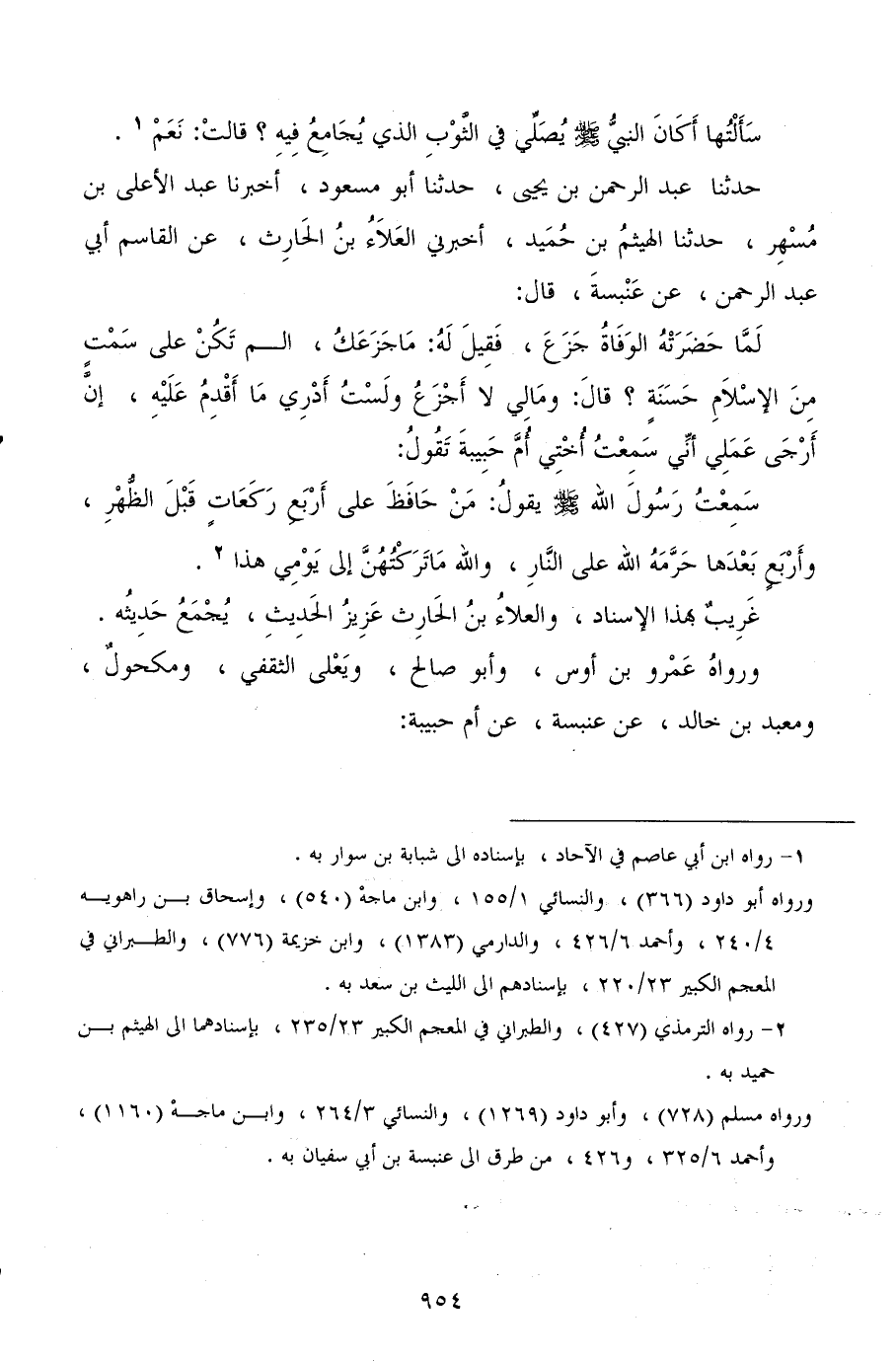 حدثنا عبد الرحمن بن يحيى، حدثنا أبو مسعود، أخبرنا عبد الأعلى بن مسهر، حدثنا الهيثم بن حميد، أخبرني العلاء بن الحارث، عن القاسم أبي عبد الرحمن، عن عنبسة، قال: لما حضرته الوفاة جزع، فقيل له: ما جزعك، الم تكن على سمت من الإسلام حسنة؟ قال: وما لي لا أجزع ولست أدري ما أقدم عليه، إن أرجى عملي أني سمعت أختي أم حبيبة تقول: سمعت رسول الله صلى الله عليه وسلم يقول: من حافظ على أربع ركعات قبل الظهر، وأربع بعدها حرمه الله على النار، والله ما تركتهن إلى يومي هذا.