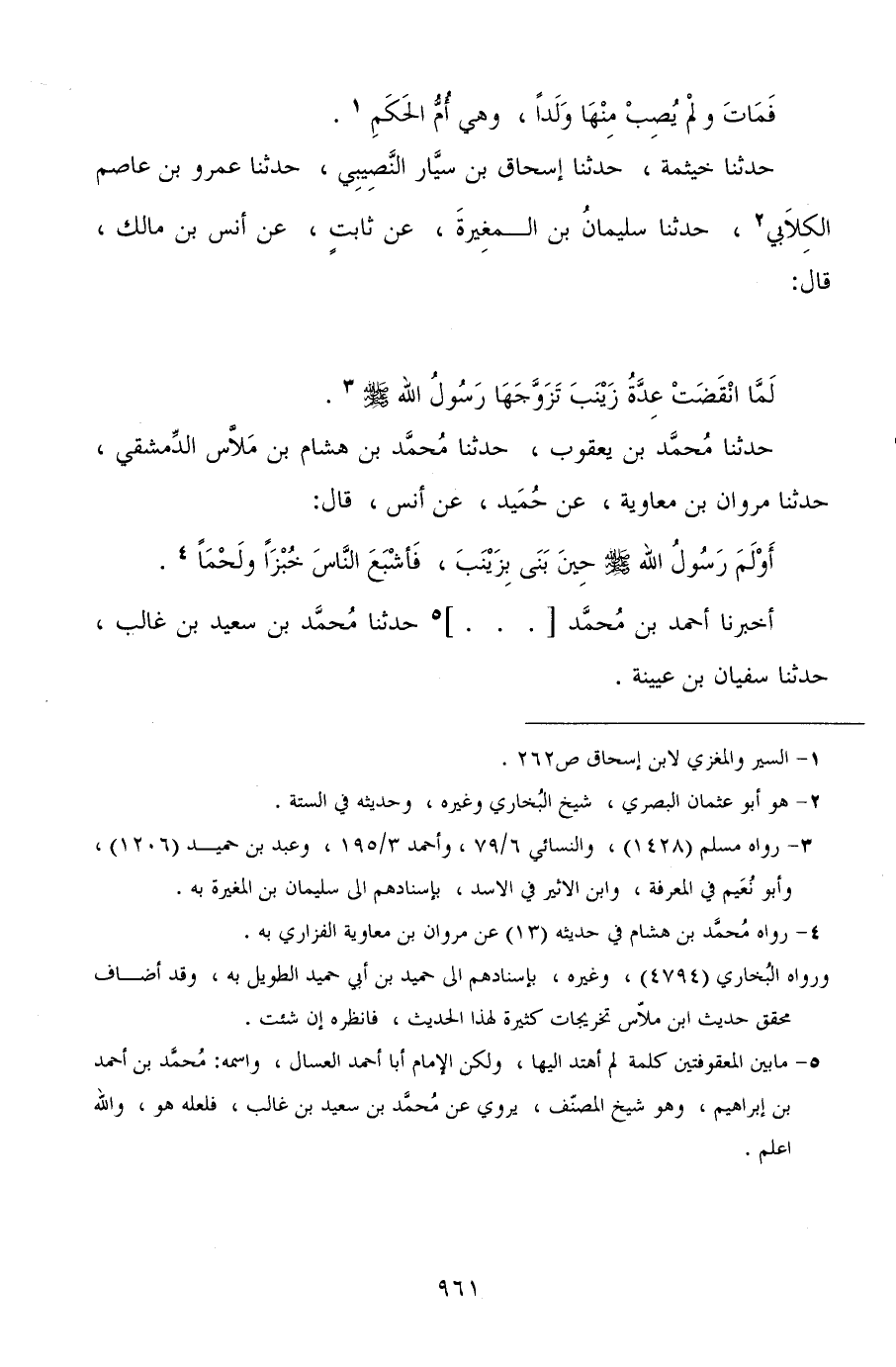 حدثنا محمد بن يعقوب، حدثنا محمد بن هشام بن ملاس النميري، حدثنا مروان بن معاوية، عن حميد، عن أنس، قال: أولم رسول الله صلى الله عليه وسلم حين بنى بزينب، فأشبع الناس خبزًا ولحما.