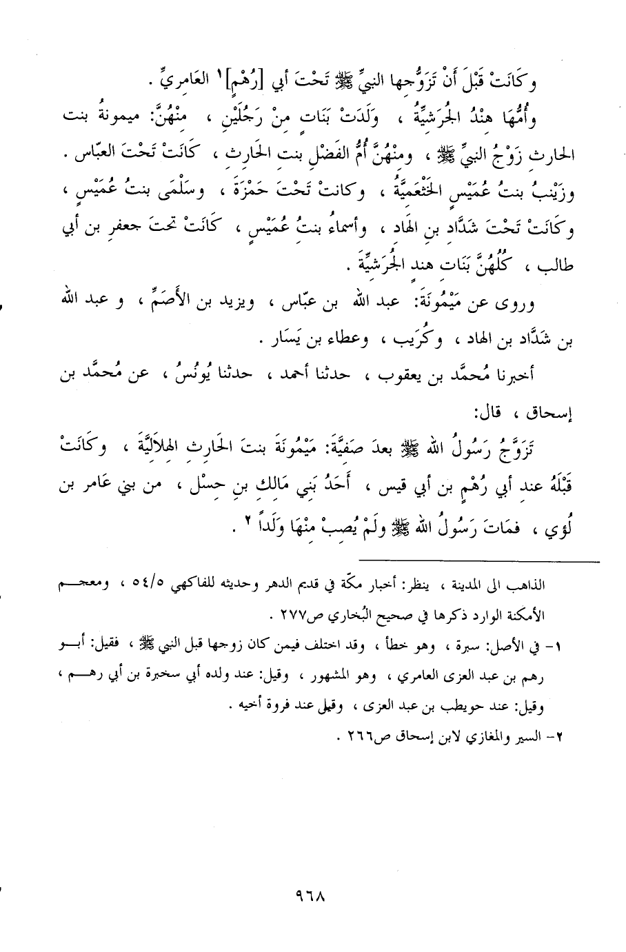 أخبرنا محمد بن يعقوب، حدثنا أحمد، حدثنا يونس، عن محمد بن إسحاق، قال: تزوج رسول الله صلى الله عليه وسلم بعد صفية: ميمونة بنت الحارث الهلالية، وكانت قبله عند أبي رهم بن أبي قيس، أحد بني مالك بن حسل، من بني عامر بن لؤي، فمات رسول الله صلى الله عليه وسلم ولم يصب منها ولدًا.