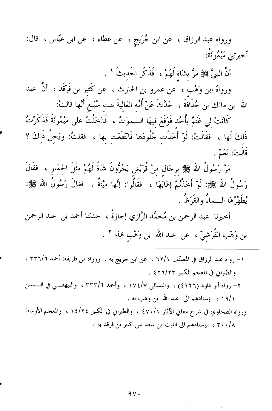 ورواه ابن وهب، عن عمرو بن الحارث، عن كثير بن فرقد، أن عبد الله بن مالك بن حذافة، حدث عن أمه العالية بنت سبيع أنها قالت: كانت لي غنم بأحد فوقع فيها الموت، فدخلت على ميمونة فذكرت ذلك لها، فقالت: لو أخذت جلودها فانتفعت بها، فقلت: ويحل ذلك؟ قالت: نعم.
