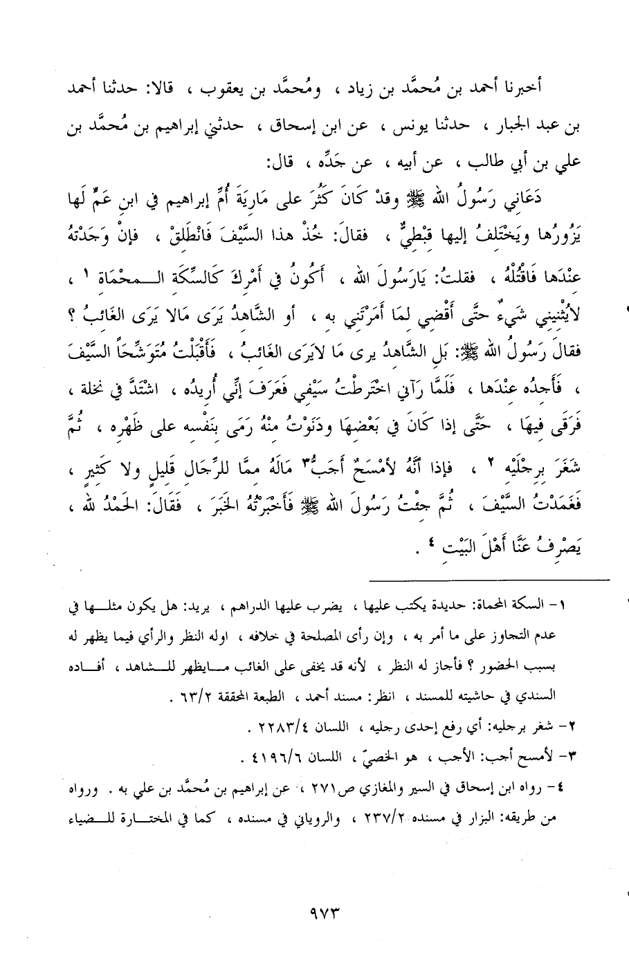 أخبرنا أحمد بن محمد بن زياد، ومحمد بن يعقوب، قالا: حدثنا أحمد بن عبد الجبار، حدثنا يونس، عن ابن إسحاق، حدثني إبراهيم بن محمد بن علي بن أبي طالب، عن أبيه، عن جده، قال: دعاني رسول الله صلى الله عليه وسلم وقد كان كثر على مارية أم إبراهيم في ابن عم لها يزورها ويختلف إليها قبطي، فقال: خذ هذا السيف فانطلق، فإن وجدته عندها فاقتله، فقلت: يا رسول الله، أكون في أمرك كالسكة المحماة، لا يثنيني شيء حتى أقضي لما أمرتني به، أو الشاهد يرى ما لا يرى الغائب؟ فقال رسول الله صلى الله عليه وسلم: بل الشاهد يرى ما لا يرى الغائب، فأقبلت متوشحًا السيف، فأجده عندها، فلما رآني اخترطت سيفي فعرف إني أريده، اشتد في نخلة، فرقى فيها، حتى إذا كان في بعضها ودنوت منه رمى بنفسه على ظهره، ثم شغر برجليه، فإذا أنه لأمسح أجب ماله مما للرجال قليل ولا كثير، فغمدت السيف، ثم جئت رسول الله صلى الله عليه وسلم فأخبرته الخبر، فقال: الحمد لله، يصرف عنا أهل البيت.