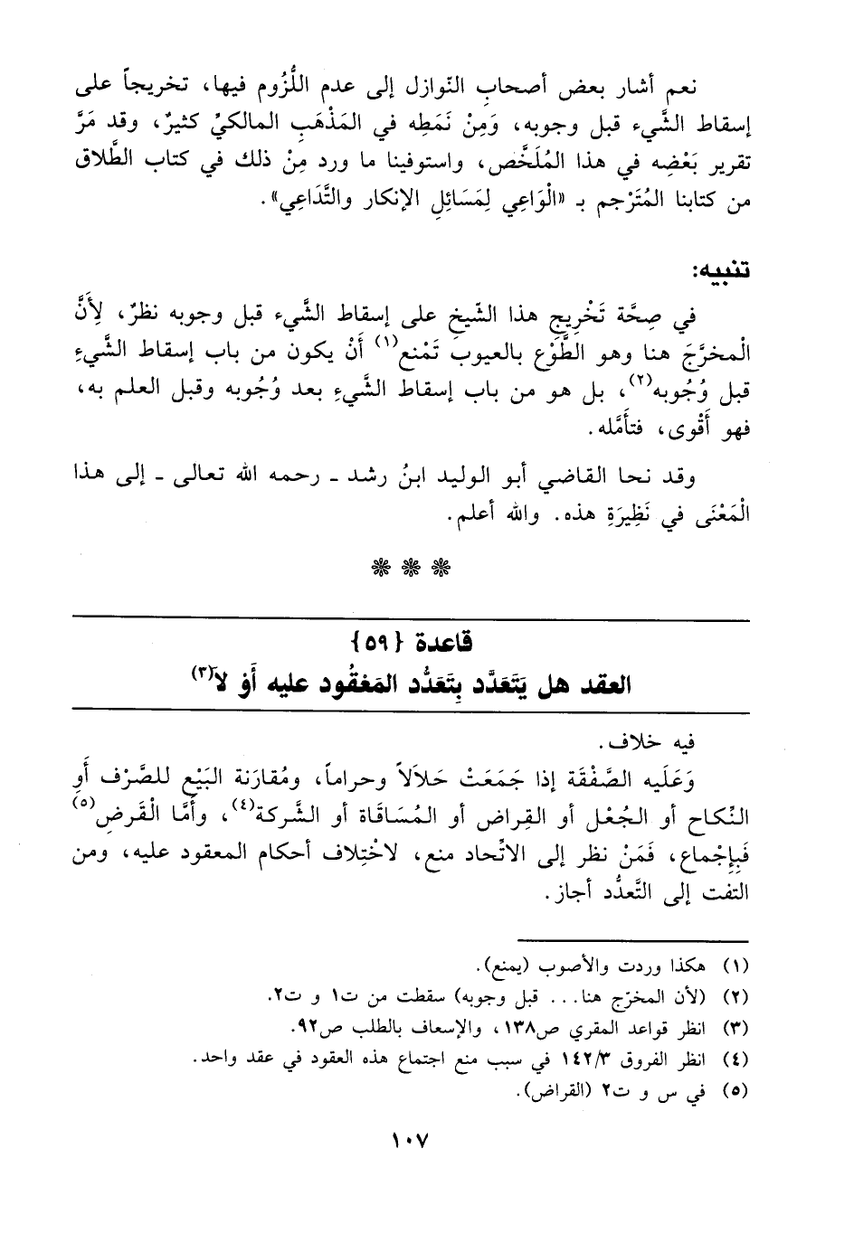 نعم أشار بعض أصحاب النوازل إلى عدم اللزوم فيها، تخريجاً على إسقاط الشيء قب لوجوبه، ومن نمطه في المذهب المالكي كثيرٌ، وقد مر تقرير بعضه في هذا الملخص، واستوفينا ما ورد من ذلك في كتاب الطلاق من كتابنا المترجم بـ"الواعي لمسائل الإنكار والتداعي".