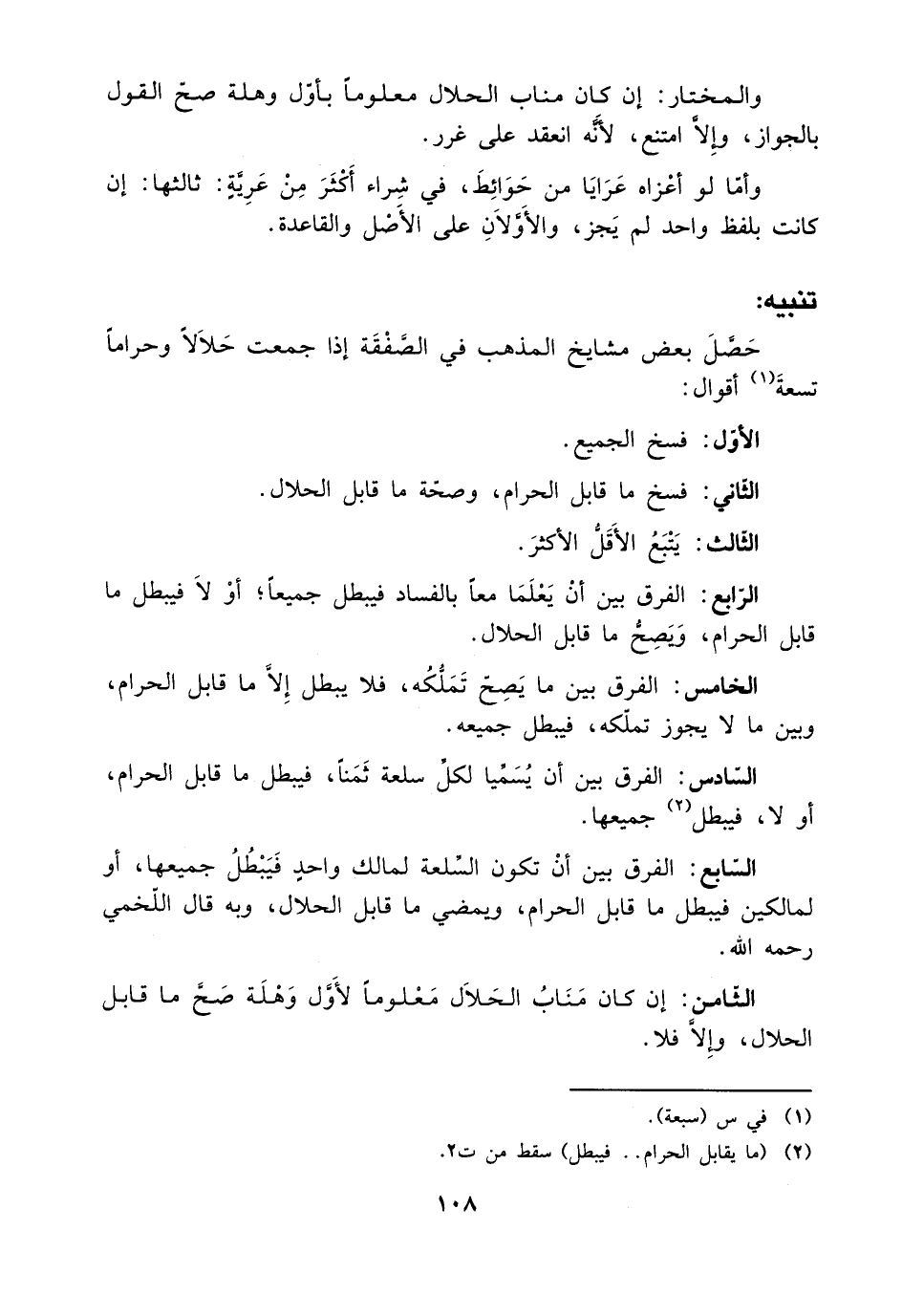 السابع: الفرق بين أن تكون السلعة لمالك واحدٍ فيبطل جميعها، أو لمالكين فيبطل ما قابل الحرام، ويمضي ما قابل الحلال، وبه قال اللخمي رحمه الله.