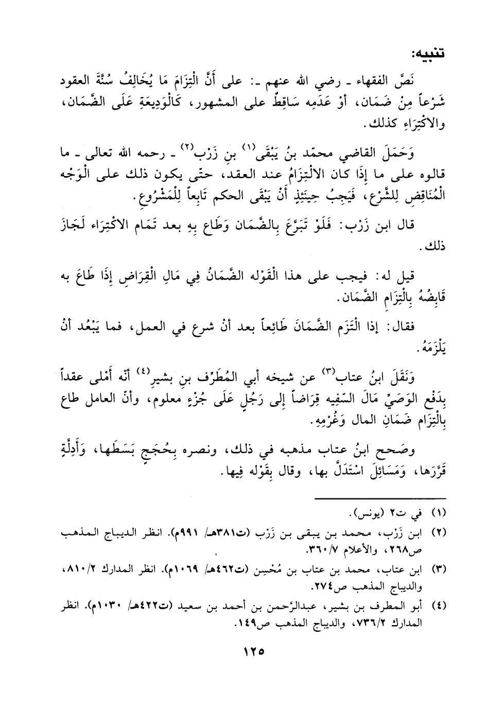 وحمل القاضي محمد بن يبقى بن زرب – رحمه الله تعالى – ما قالوه على ما إذا كان الالتزام عند العقد، حتى يكون ذلك على الوجه المناقض للشرع، فيجب حينئذٍ أن يبقى الحكم تابعاً للمشروع.