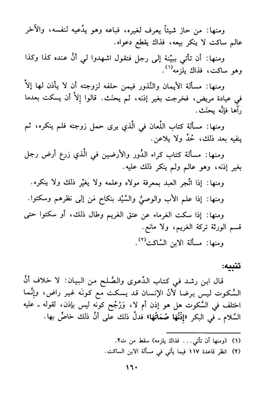 ومنها: مسألة الأيمان والنذور فيمن حلفه لزوجته أن لا يأذن لها إلا في عيادة مريض، فخرجت بغير إذنه، لم يحنث. قالوا إلا أن يسكت بعدما رآها فإنه يحنث.