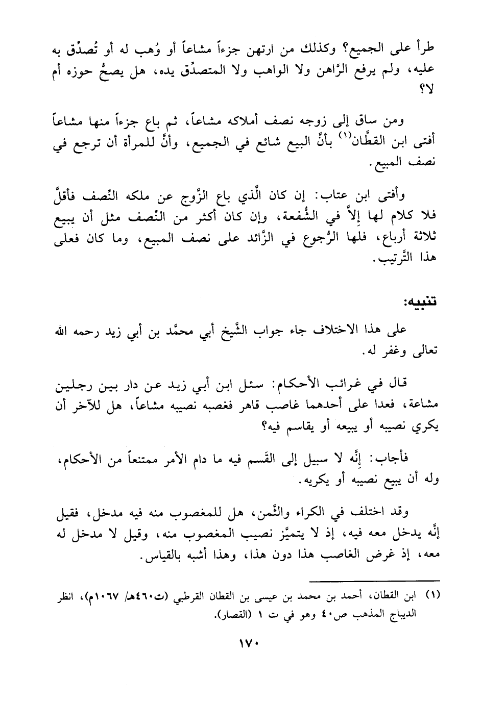 ومن ساق إلى زوجه نصف أملاكه مشاعاً، ثم باع جزءاً منها مشاعاً أفتى ابن القطان بأن البيع شائع في الجميع، وأن للمرأة أن ترجع في نصف المبيع.