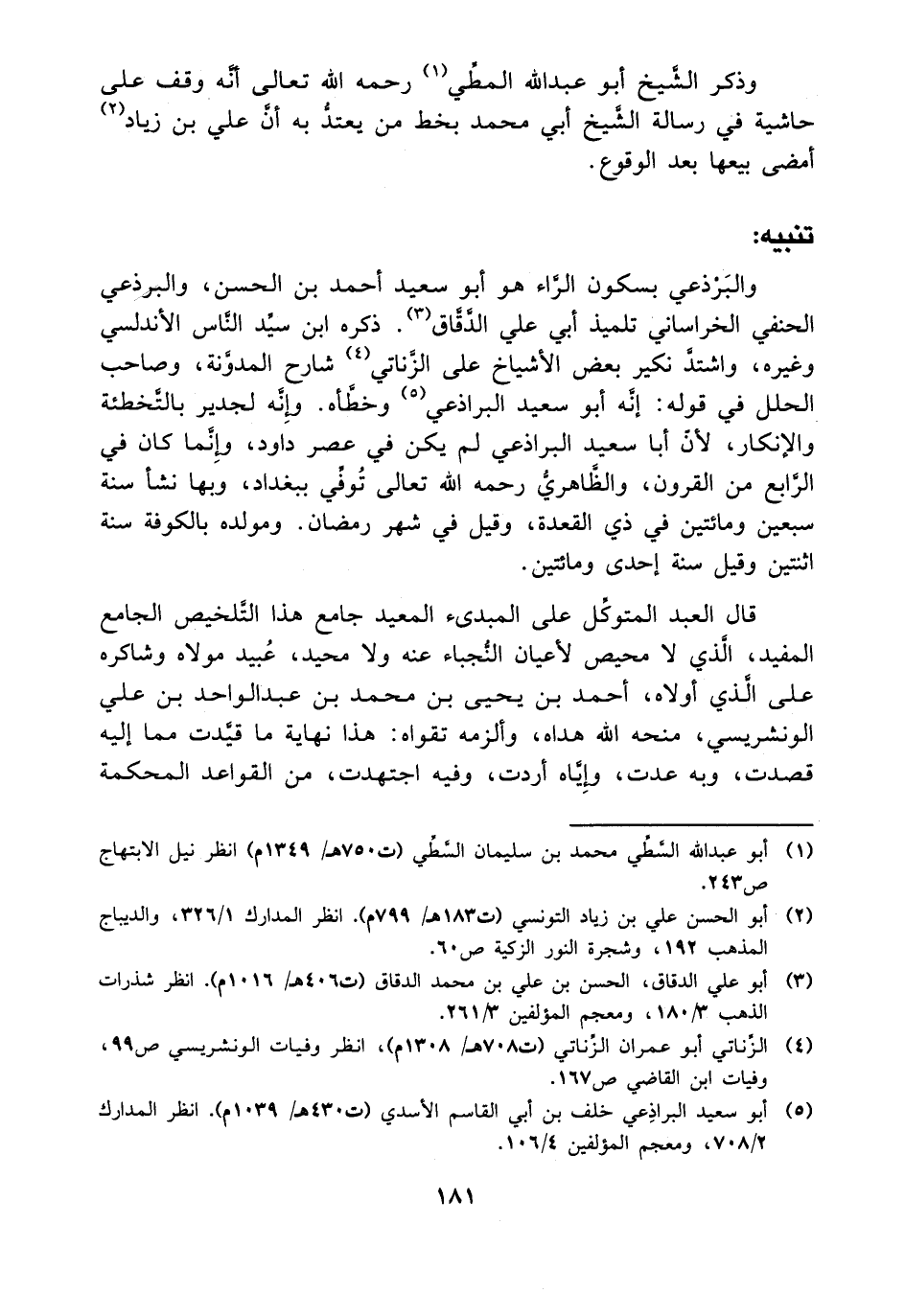 والبرذعي بسكون الراء هو أبو سعيد أحمد بن الحسن، والبرذعي الحنفي الخراساني تلميذ أبي علي الدقاق. ذكره ابن سيد الناس الأندلسي وغيره، واشتد نكير بعض الأشياخ على الزناتي شارح المدونة، وصاحب الحلل في قوله: إنه أبو سعيد البراذعي وخطأه. وإنه لجدير بالتخطئة والإنكار، لأن أبا سعيد البراذعي لم يكن في عصر داود، وإنما كان في الرابع من القرون، والظاهري رحمه الله تعالى تُوفي ببغداد، وبها نشأ سنة سبعين ومائتين في ذي القعدة، وقيل في شهر رمضان. ومولده بالكوفة سنة اثنتين وقيل سنة إحدى ومائتين.