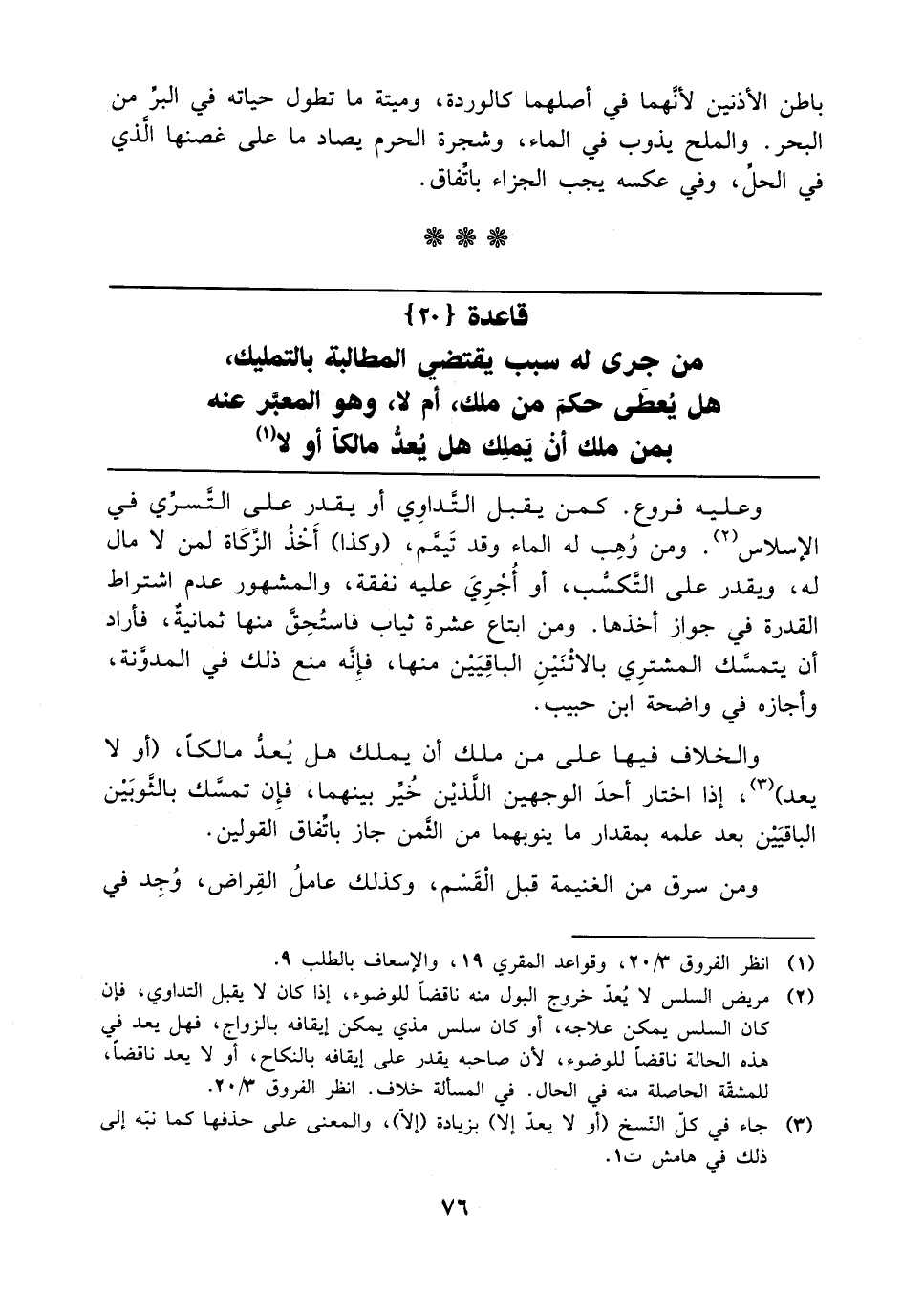 وعليه فروع. كمن يقبل التداوي أو يقدر على التسري في الإسلاس. ومن وُهِب له الماء وقد تيمم، (وكذا) أخذُ الزكاة لمن لا مال له، ويقدر على التكسب، أو أُجري عليه نفقة، والمشهور عدم اشتراط القدرة في جواز أخذها. ومن ابتاع عشرة ثياب فاستُحق منها ثمانيةٌ، فأراد أن يتمسك المشتري بالاثنين الباقيين منها، فإنه منع ذلك في المدونة، وأجازه في واضحة ابن حبيب.