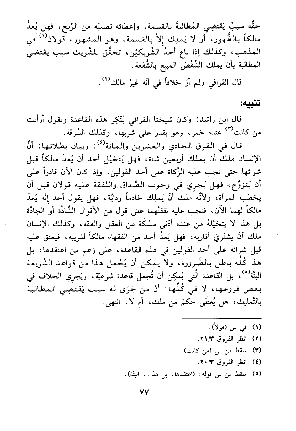 قال في الفرق الحادي والعشرين والمائة: وبيان بطلانها: أن الإنسان ملك أن يملك أربعين شاة، فهل يتخيل أحد أن يُعدّ مالكاً قبل شرائها حتى تجب عليه الزكاة على أحد القولين، وإذا كان الآن قادراً على أن يتزوج، فهل يجري في وجوب الصداق والنفقة عليه قولان قبل أن يخطب المرأة، ولأنه ملك أن يملك خادماً ودابة، فهل يقول أحد إنه يُعد مالكاً لهما الآن، فتجب عليه نفقتهما على قول من الأقوال الشاذة أو الجادة بل هذا لا يتخيله من عنده أدنى مسكة من العقل والفقه، وكذلك الإنسان ملك أن يشتري أقاربه، فهل يعد أحد من الفقهاء مالكاً لقريبه، فيعتق عليه قبل شرائه على أحد القولين في هذه القاعدة، على زعم من اعتقدها، بل هذا كله باطل بالضرورة، ولا يمكن أن يُجعل هذا من قواعد الشريعة البتة، بل القاعدة التي يُمكن أن تُجعل قاعدة شرعية، ويجري الخلاف في بعض فروعها، لا في كلها: أن من جرى له سبب يقتضي المطالبة بالتمليك، هل يُعطى حكم من ملك، أم لا. انتهى.
