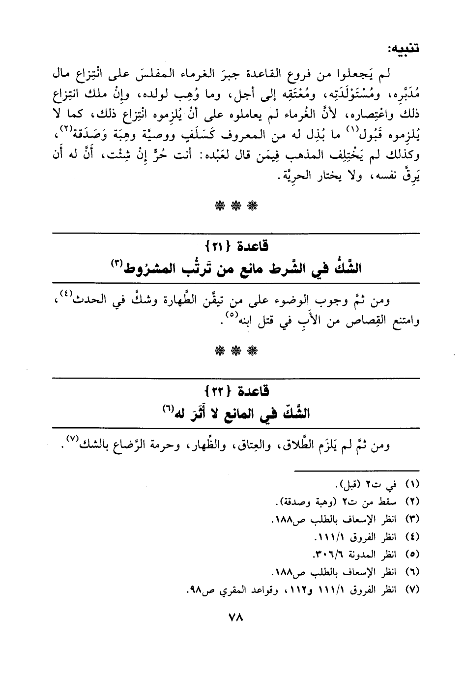 لم يجعلوا من فروع القاعدة جبر الغرماء المفلس على انتزاع مال مُدبره، ومستولدته، ومعتقه إلى أجل، وما وُهب لولده، وإن ملك انتزاع ذلك واعتصاره، لأن الغرماء لم يعاملوه على أن يُلزموه انتزاع ذلك، كما لا يُلزموه قبول ما بُذل له من المعروف كسلفٍ ووصية وهبة وصدقة، وكذلك لم يختلف المذهب فيمن قال لعبده: أنت حر إن شئت، أن له أن يرق نفسه، ولا يختار الحرية.