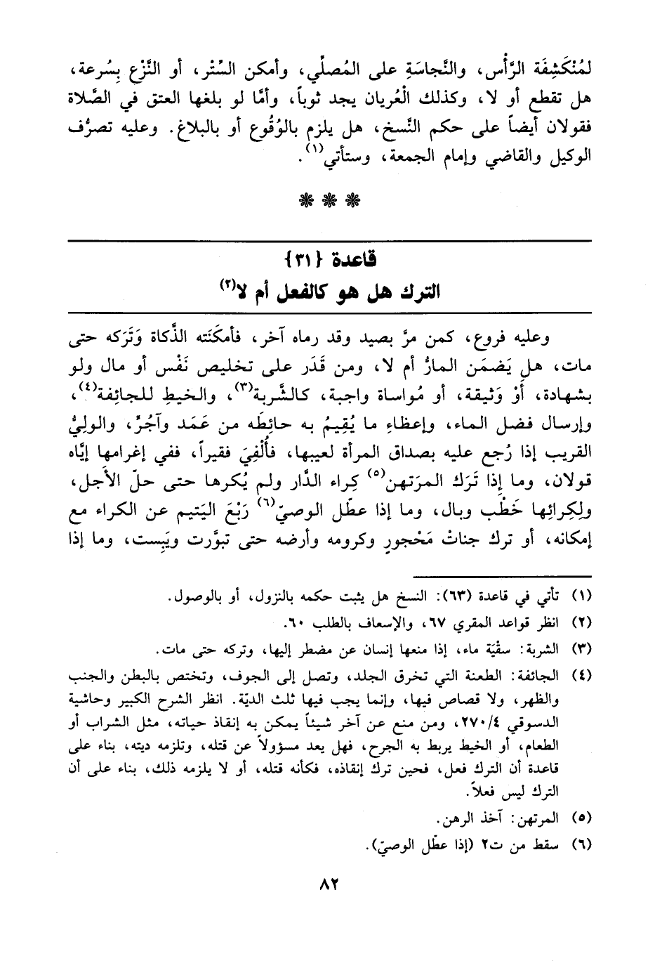 وعليه فروع، كمن مر بصيد وقد رماه آخر، فأمكنته الذكاة وتركه حتى مات، هل يضمن المار أم لا، ومن قدر على تخليص نفس أو مال ولو بشهادة، أو وثيقة، أو مواساة واجبة، كالشربة، والخيط للجائفة، وإرسال فصل الماء، وإعظاء ما يُقيمُ به حائطه من عمد وآجُر، والولي القريب إذا رُجع عليه بصداق المرأة لعيبها، فأُلفي فقيراً، ففي إغرامها إياه قولان، وما إذا ترك المرتهن كراء الدار ولم يُكرها حتى حل الأجل، ولكرائها خطب وبال، وما إذا عطل الوصي ربع اليتيم عن الكراء مع إمكانه، أو ترك جنات محجورٍ وكرومه وأرضه حتى تبورت ويبست، وما إذا