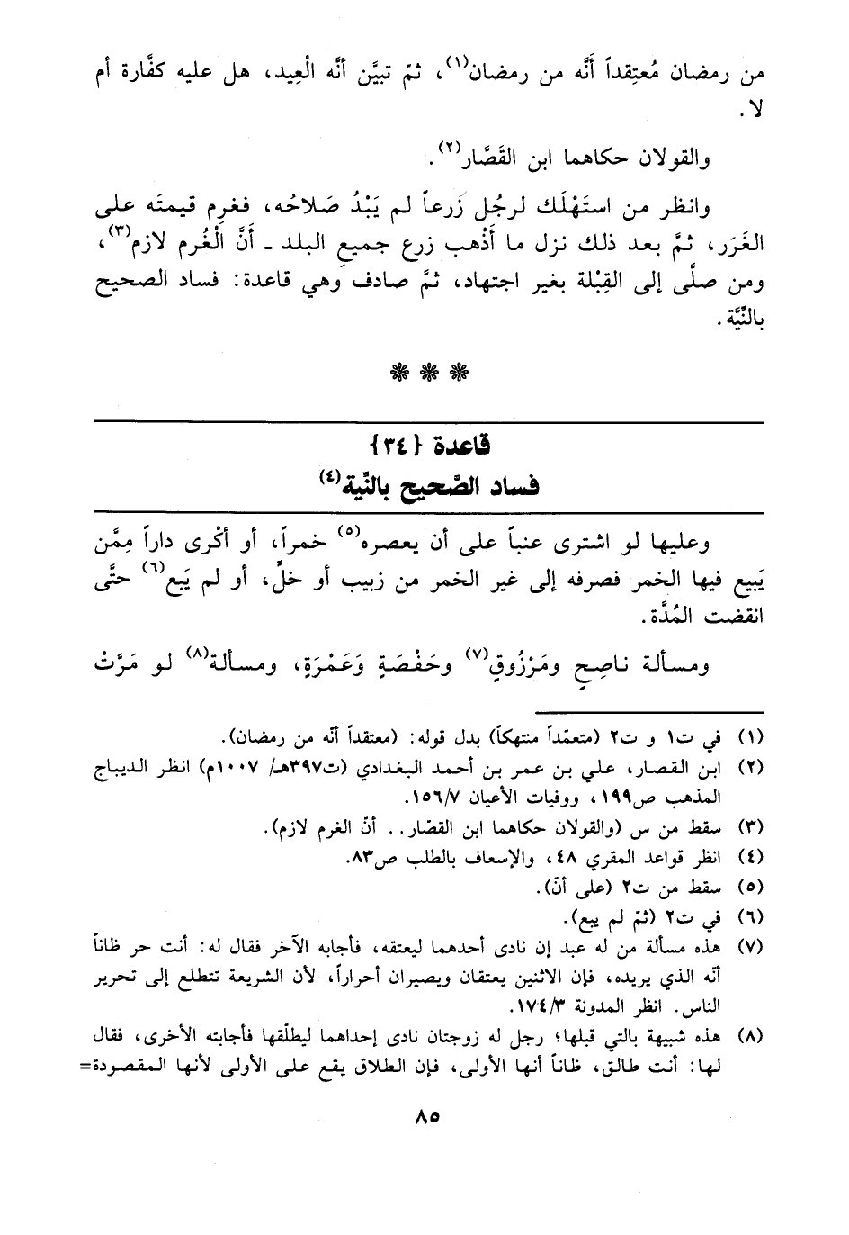 وانظر من استهلك لرجل زرعاً لم يبدُ صلاحه، فغرم قيمته على الغرر، ثم بعد ذلك نزل ما أذهب زرع جميع البلد- أن الغرم لازم، ومن صلى إلى القبلة بغير اجتهاد، ثم صادف وهي قاعدة: فساد الصحيح بالنية.
