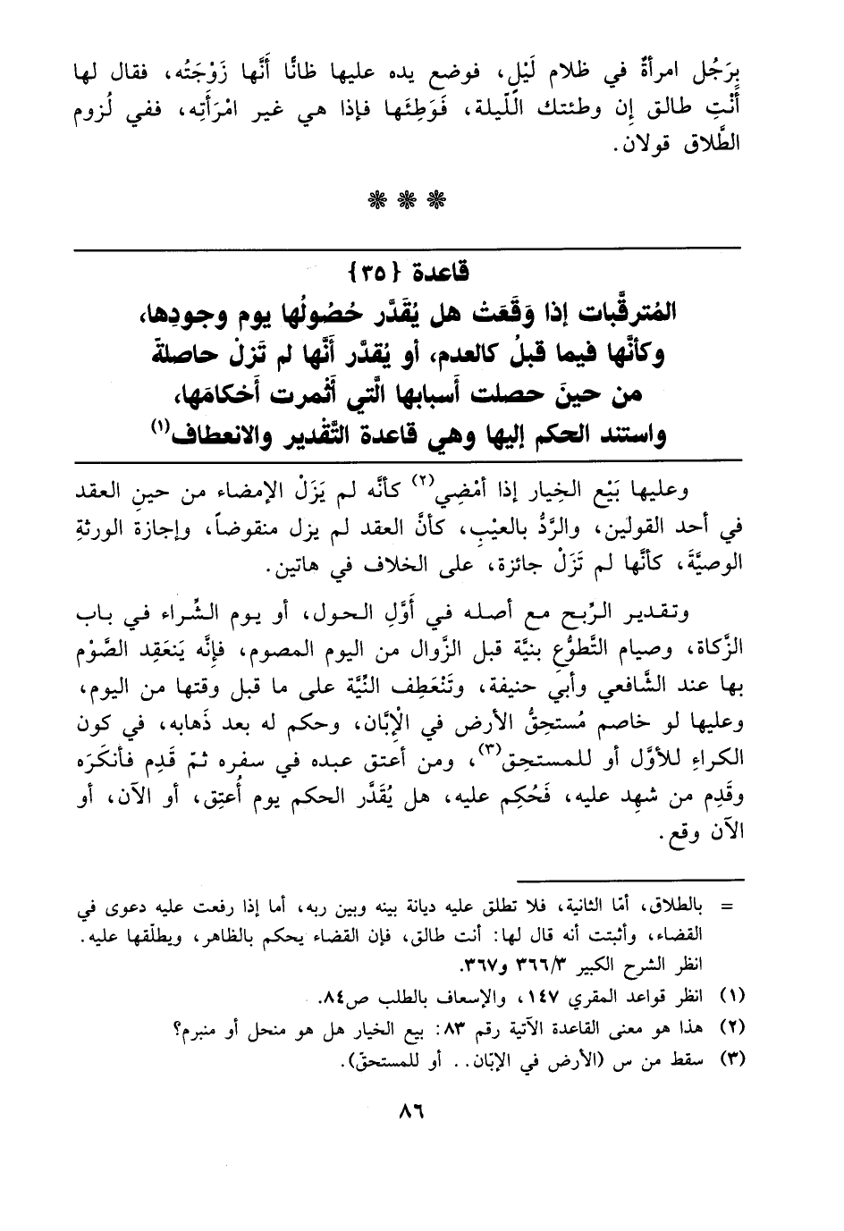 وتقدير الربح مع أصله في أول الحول، أو يوم الشراء في باب الزكاة، وصيام التطوع بنية قبل الزوال من اليوم المصوم، فإنه ينعقد الصوم بها عند الشافعي وأبي حنيفة، وتنعطف النية على ما قبل وقتها من اليوم، وعليها لو خاصم مستحق الأرض في الإبان، وحكم له بعد ذهابه، في كون الكراء للأول أو للمستحق، ومن أعتق عبده في سفره ثم قدم فأنكره وقدم من شهد عليه، فحُكم عليه، هل يُقدر الحكم يوم أُعتق، أو الآن، أو الآن وقع.